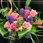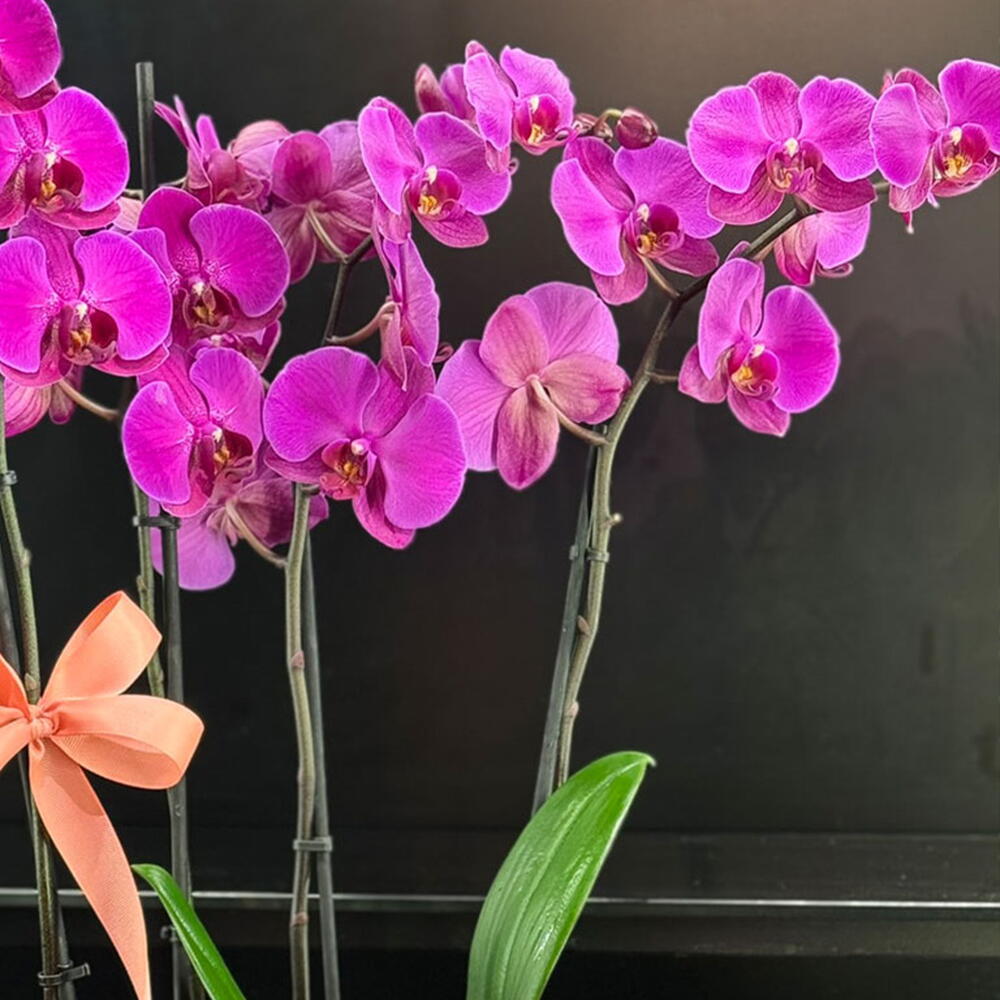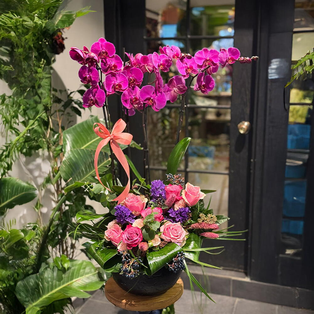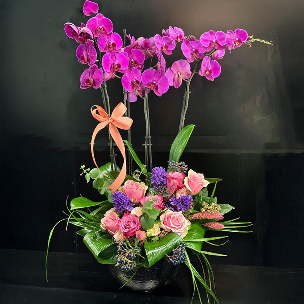 Seramik bir vazoda hazırlanmış şık ve etkileyici bir aranjman; dört dal fuşya Phalaenopsis orkide, tabanda pembe güller, dekoratif yapraklar ve mevsimlik çiçeklerle zenginleştirilmiştir. Yaklaşık ürün yüksekliği: 70 cm.