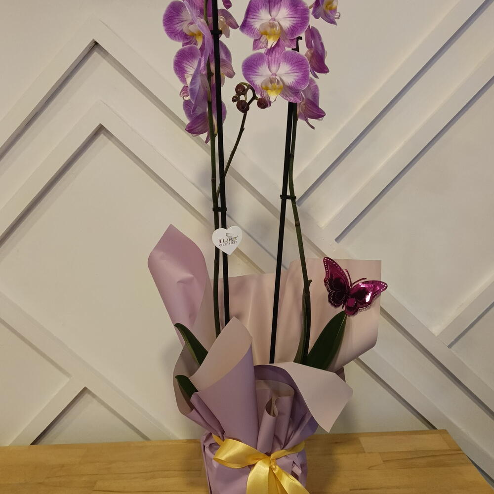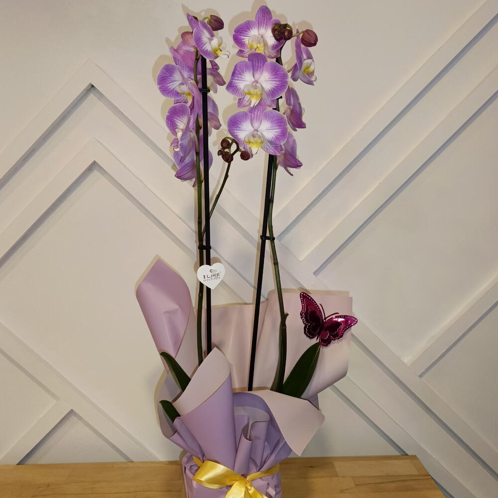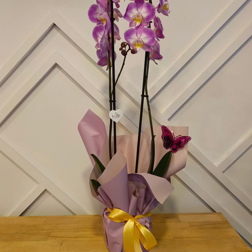 Çift Dallı Mor-Beyaz Phalaenopsis Orkide – Beyaz Seramik Saksıda Zarafet ve sadeliğin en şık hâllerinden biri olan çift dallı mor-beyaz Phalaenopsis orkide, beyaz seramik saksısı ve mor hediye paketiyle göz alıcı bir sunum oluşturur. Mor çiçeklerin merkezindeki beyaz tonlar, orkideye hem modern hem de romantik bir hava katar. Ev ve ofis dekorasyonunda kolayca uyum sağlayan bu özel orkide, sevdiklerinize hediye etmek için de mükemmel bir tercihtir. Haftada bir kez sulama ile kolay bakım sağlar ve doğru koşullarda uzun süre çiçekli kalabilir. Özellikler Bitki Türü: Çift dallı Phalaenopsis orkide Renk: Mor çiçek – beyaz detaylı merkez Saksı: Beyaz seramik saksı Yükseklik: Yaklaşık 55–65 cm Sunum: Mor hediye paketi ve beyaz kurdele Bakım: Haftada bir sulama yeterlidir Kullanım Alanı: Ev, ofis, özel günler, tebrik, doğum günü ve hediye amaçlı.