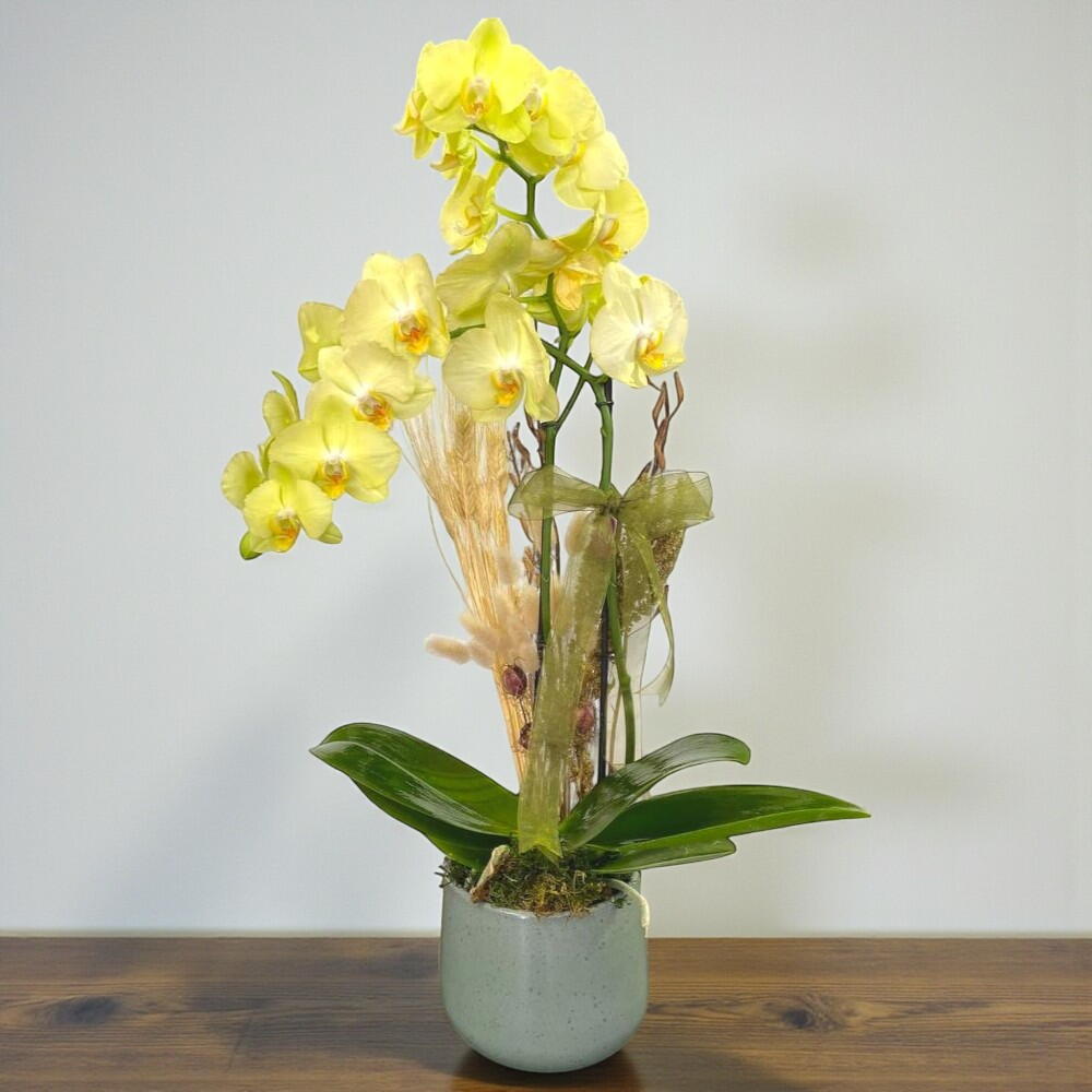 Bu zarif sarı orkide, doğanın en güzel armağanlarından biri olarak bulunduğu ortama huzur ve zarafet katıyor. Parlak sarı çiçekleri ve göz alıcı yeşil yapraklarıyla dikkat çeken bu orkide, modern ve şık seramik saksısıyla yaşam alanlarınıza sofistike bir hava katıyor. Kurutulmuş doğal süslemeler ve dekoratif kurdele detayı, çiçeğin estetik görünümünü tamamlıyor. Ofisler, evler ve özel günlerde sevdiklerinize hediye etmek için mükemmel bir tercihtir.