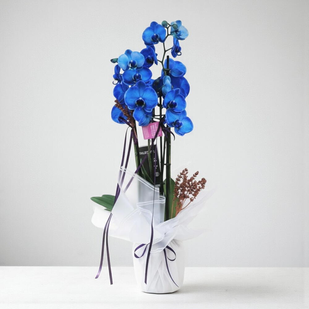 Mavi orkide ikili 70-80 cm boyunda dekoratif kuru çiçekler ile süslenmiştir