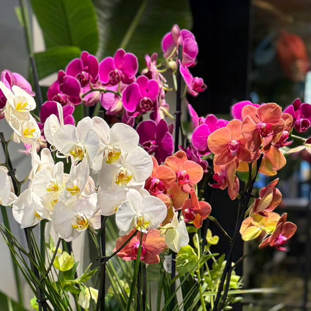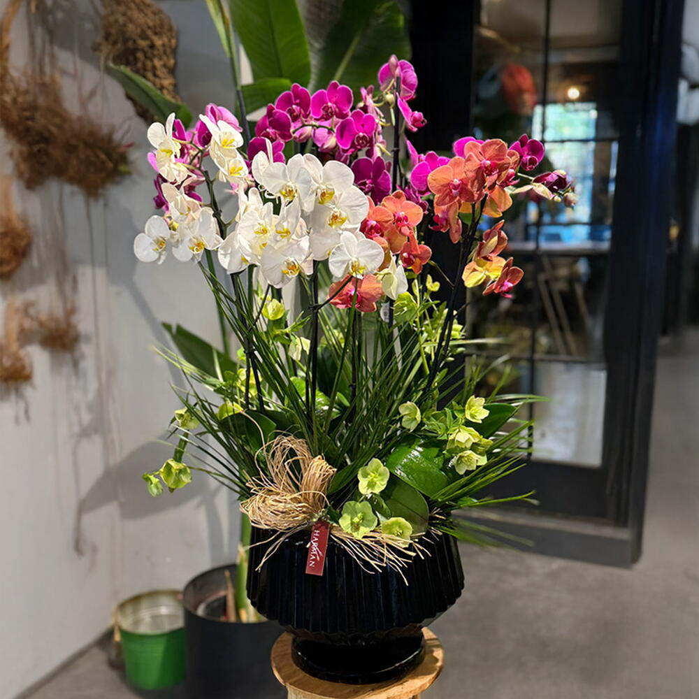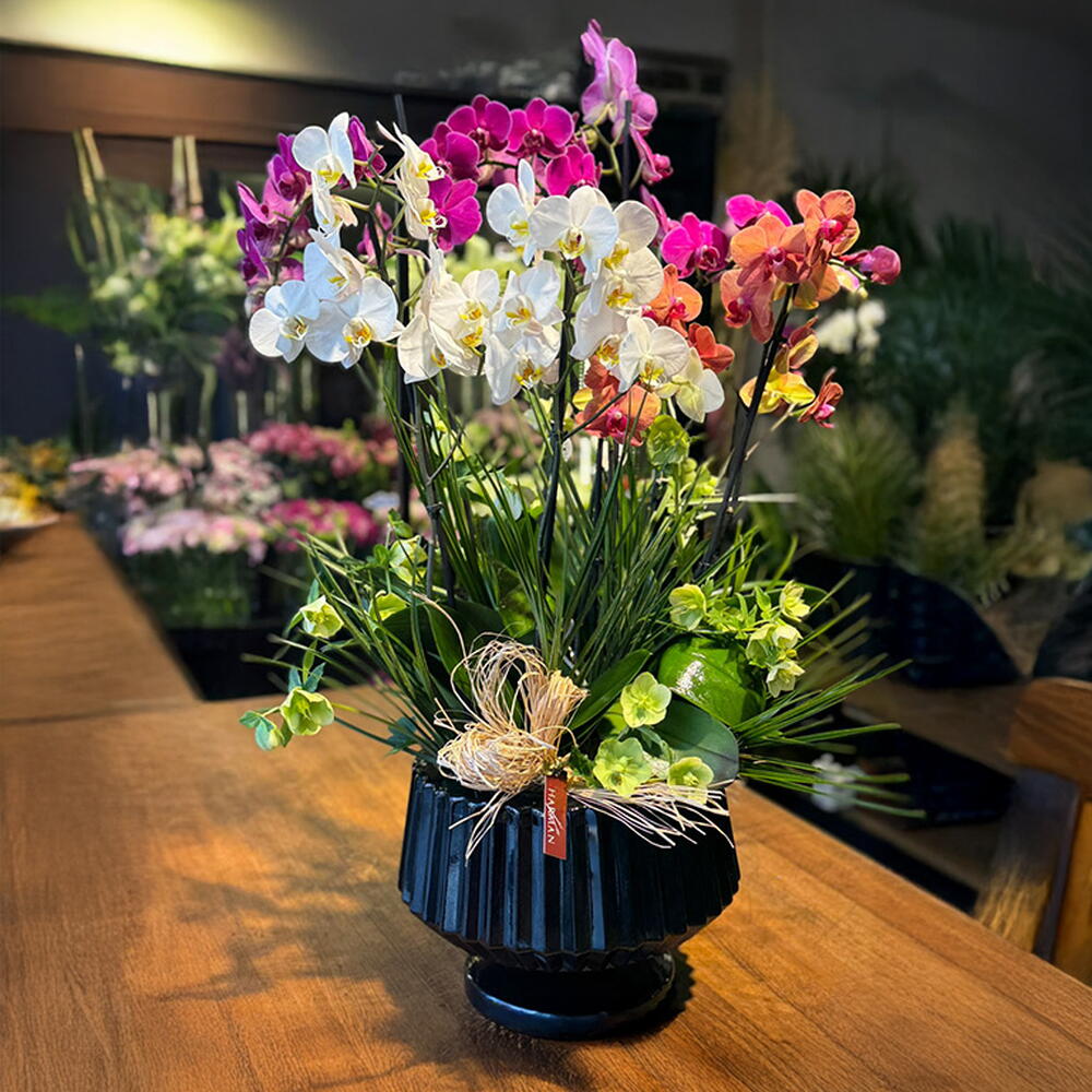 Evler ve hediyeler için lezzetli bir seçenek: 3 ayrı orkide, beyaz, fuşya ve turuncu renklerinde (toplam 6 sap) siyah kaideli cam tasarım vazo içinde, dekoratif aksesuar yapraklarıyla süslenmiştir. Ürünün yaklaşık yüksekliği 75-80 cm.