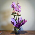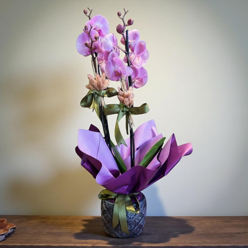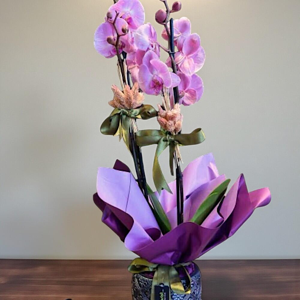 Zarafetin en romantik tonuyla buluştuğu bu pembe orkide aranjmanı, bulunduğu her ortama büyüleyici bir güzellik katıyor. Yumuşak pembe çiçekleri, uzun ve zarif saplarıyla hem göz alıcı hem de huzur verici bir görünüm sunar. Mor ve yeşil tonlardaki özel ambalajı, tasarıma modern bir dokunuş ekleyerek onu özel günlerde verilebilecek en şık hediyelerden biri hâline getirir. Orkide, doğru bakım uygulandığında uzun süre çiçekli kalabilen narin bir bitkidir.