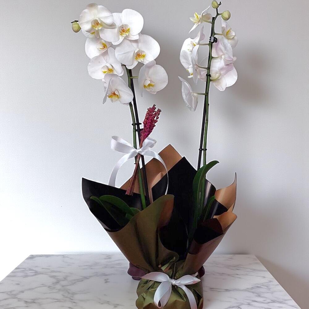 Doğanın en zarif çiçeklerinden biri olan beyaz orkide, saflığın, zarafetin ve sevginin sembolüdür. Şık saksısı ve zarif ambalajıyla tamamlanan bu çift dallı orkide, bulunduğu her ortama sofistike bir hava katar. Ofis dekorasyonu, özel gün kutlamaları veya sevdiklerinize anlamlı bir hediye için mükemmel bir seçimdir.