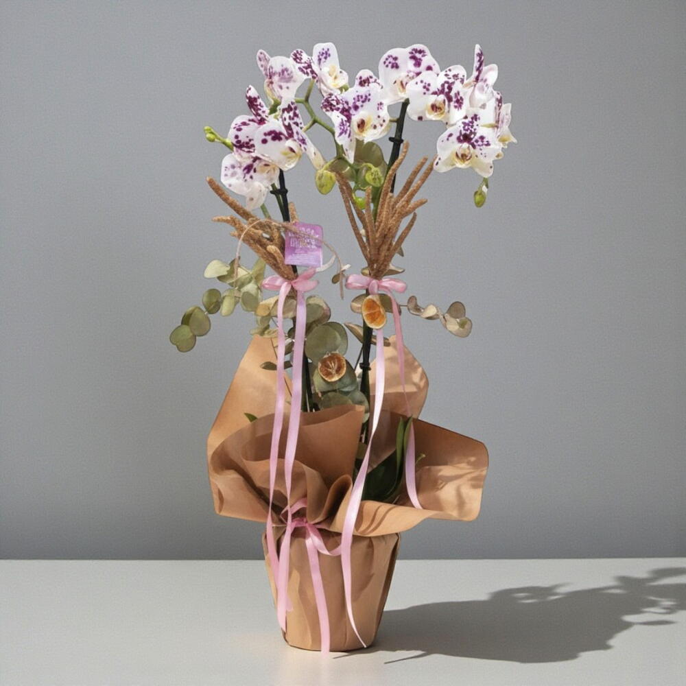 Bu zarif orkideler, evinize renk katacak ve atmosferi güzelleştirecek mükemmel bir hediye seçeneği. Beyaz ve mor tonlarının zarif karışımını sunan bu orkide, şıklığı ve zarafetiyle dikkat çeker. İki daldan oluşan bu orkide, her ortama uyum sağlayacak şekilde düzenlenmiş ve şeffaf kurdelelerle bağlanmıştır. Evinizin herhangi bir köşesinde dikkat çekici bir dekoratif unsur olacak.
