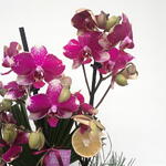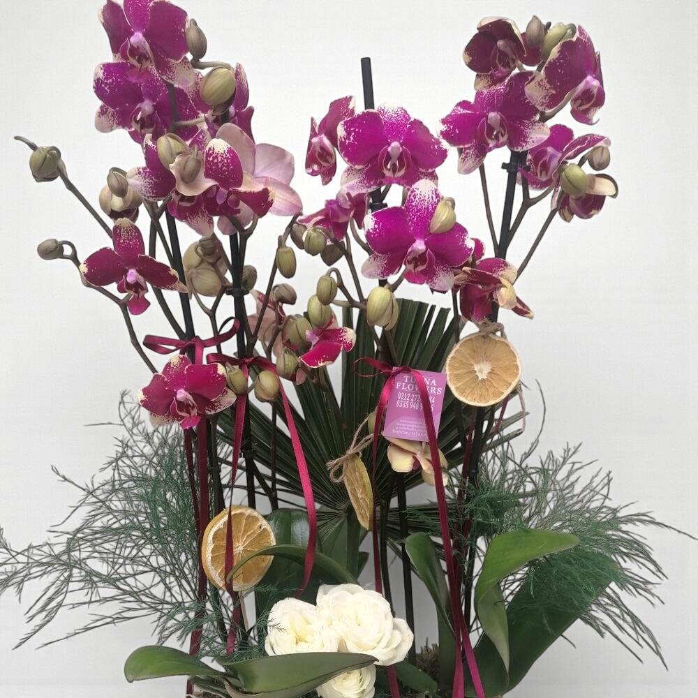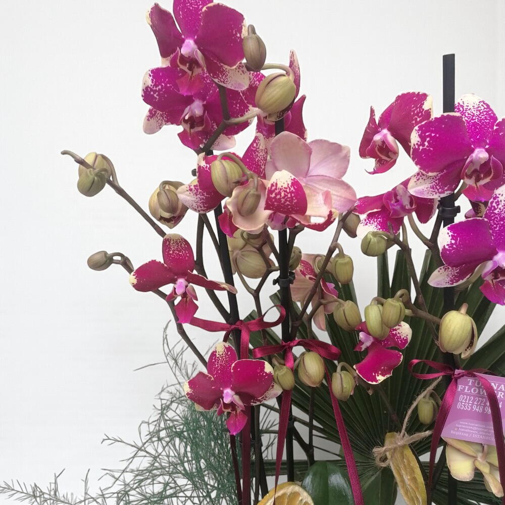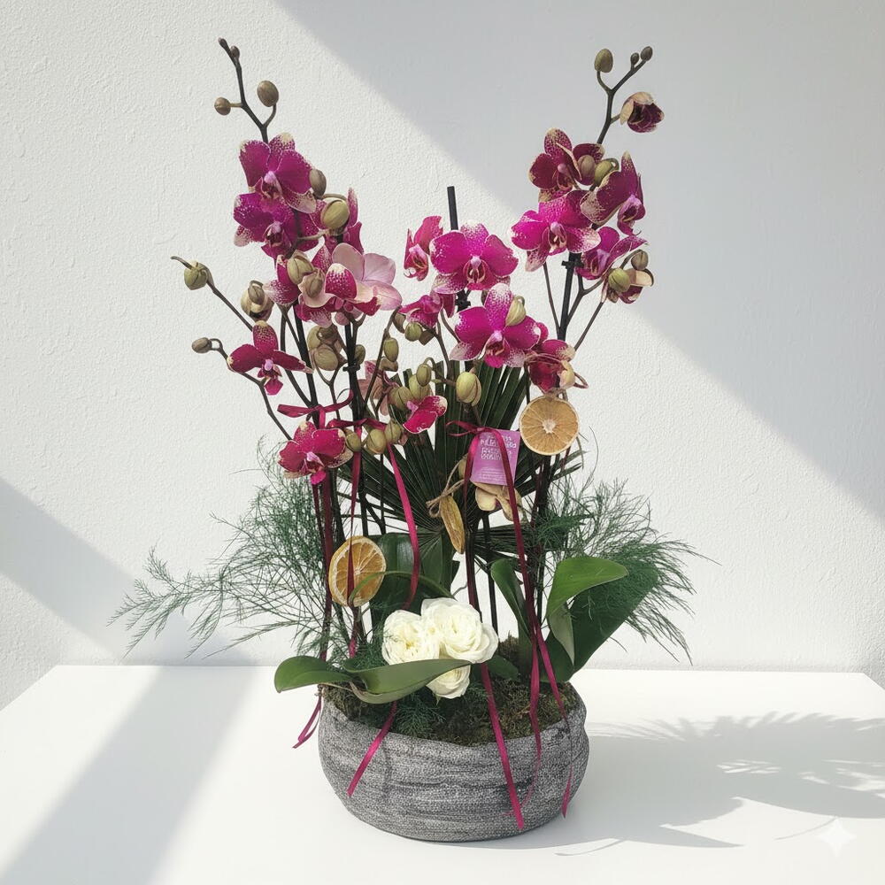 Zarafetin ve asaletin simgesi orkide, bu şık aranjmanda modern bir yorumla hayat buluyor 💜. Mor tonlardaki Phalaenopsis orkideler, zarif yapraklar ve doğal kuru meyve detaylarıyla birleşerek göz alıcı bir görsellik sunuyor. Hem dekoratif hem de anlamlı bir hediye alternatifi olan bu düzenleme, bulunduğu ortama sofistike bir hava katar. Sevdiklerinize zarif bir jest yapmak veya yaşam alanınıza doğallık katmak için mükemmel bir tercihtir.