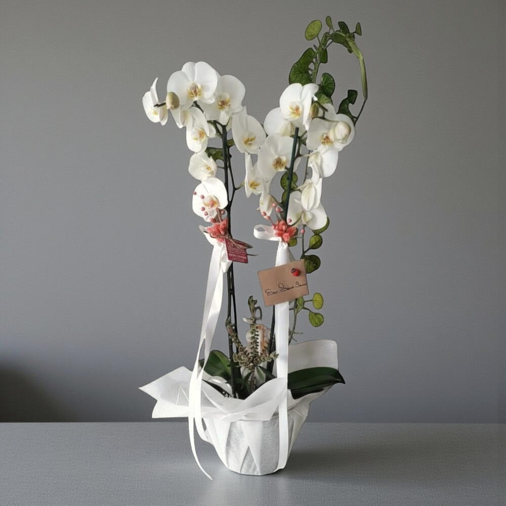 Bu zarif beyaz orkideler, evinize zarafet ve şıklık katacak harika bir dekoratif bitkidir. Her biri özenle seçilmiş ve dikkatle yerleştirilmiş bu orkide, yaşam alanınıza doğal bir güzellik sunar. Zarif beyaz çiçekleriyle dikkat çekerken, üzerine bağlanmış şık beyaz kurdeleler ve eklenen dekoratif detaylar, bitkiye ekstra bir zarafet katmaktadır.