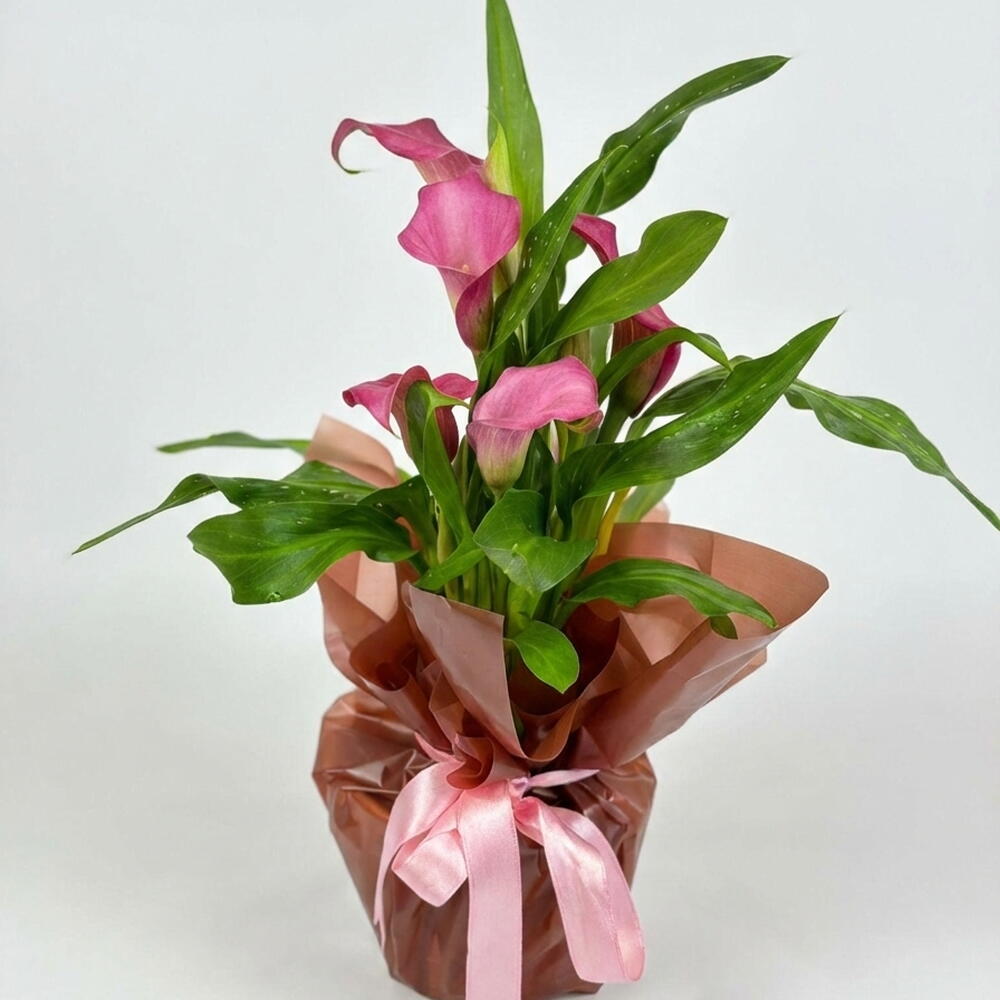 Zarafetin ve asaleti simgeleyen pembe gala çiçeği (Calla Lily), özel tasarım ambalajı ve şık kurdele detayıyla sevdiklerinize anlamlı bir hediye alternatifi sunar. Canlı yeşil yaprakları ve göz alıcı pembe çiçekleriyle bulunduğu ortama ferahlık ve şıklık katar. Özel günlerde, doğum günü, yeni iş, teşekkür ya da “içimden geldi” demek için zarif bir seçimdir. Modern ve dekoratif sunumu sayesinde hem ev hem ofis ortamına uyum sağlar.