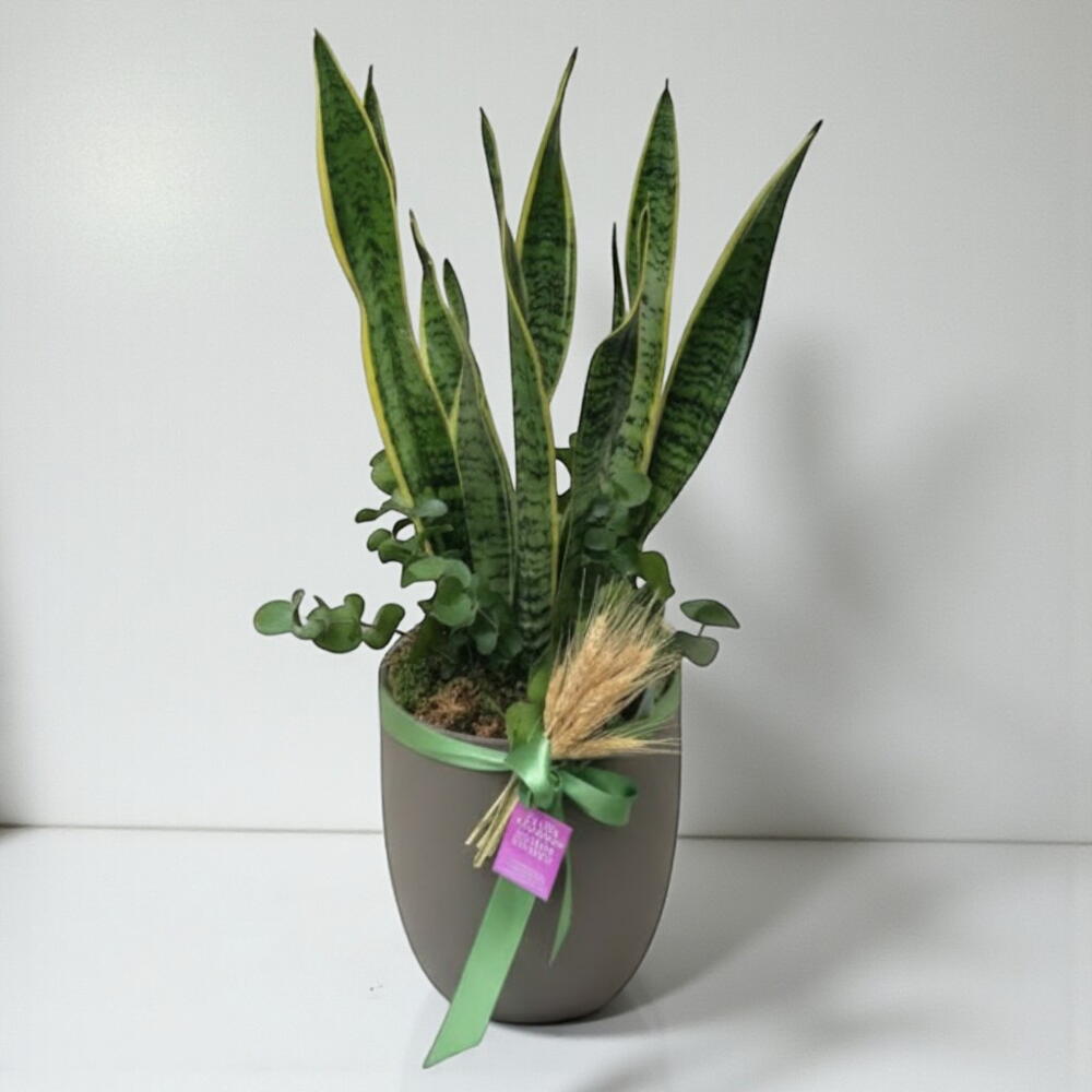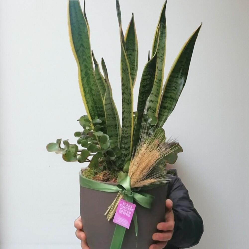 Bu bitki, evinizi güzelleştirecek harika bir dekoratif çiçek düzenlemesidir. Yılan bitkisi (Sansevieria) olarak bilinen bu bitki, sağlam ve şık yaprakları ile bilinir. Renkli, çizgili yaprakları ve yeşil tonlarındaki zenginliğiyle her alanda etkileyici bir görünüm sağlar. Bitki, minimum bakım ile uzun süre sağlıklı kalır ve evinizin havasını taze tutar. Üstüne eklenmiş olan eucalyptus ve buğday başakları, doğal ve şık bir görünüm katmaktadır. Modern bir saksıda sunulan bu bitki, her odada mükemmel bir atmosfer yaratacaktır.