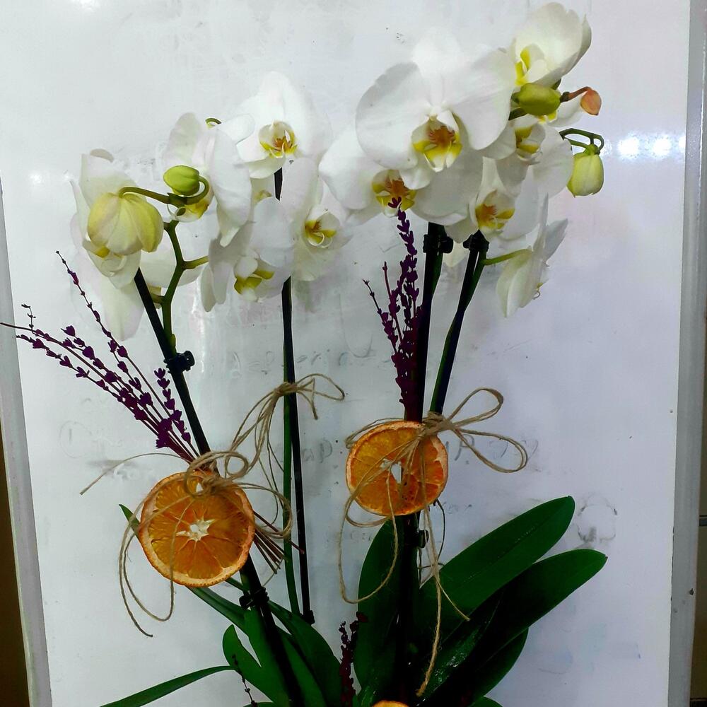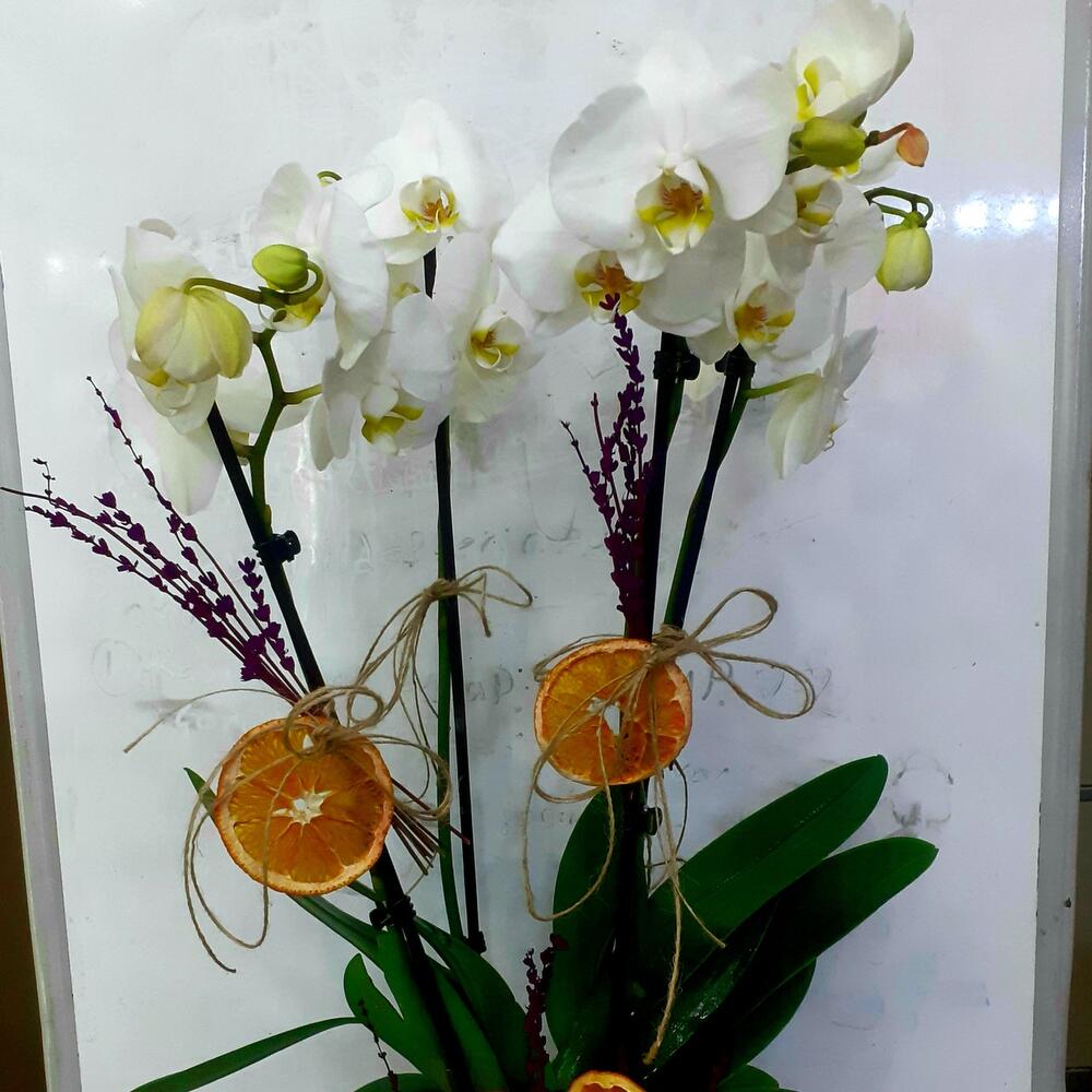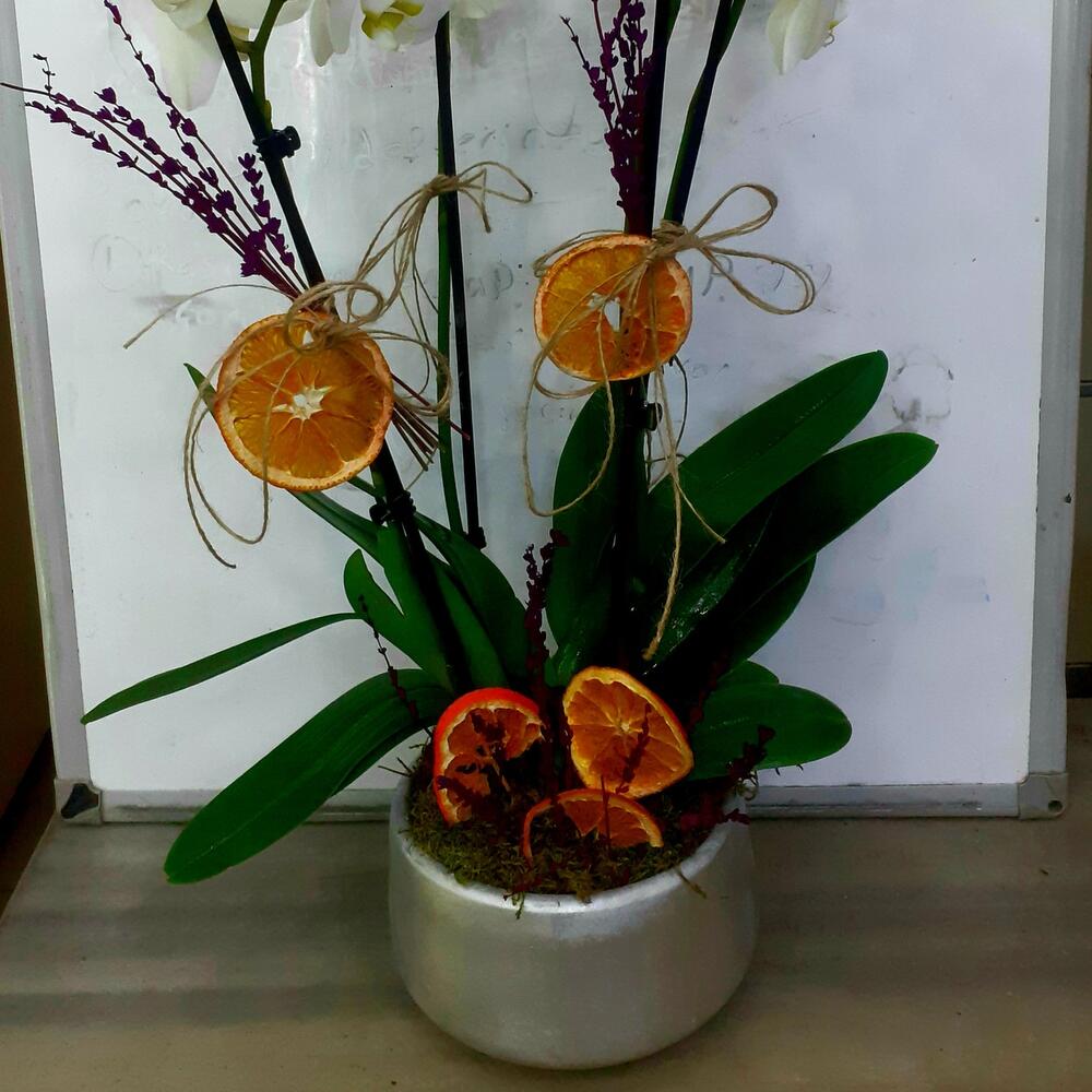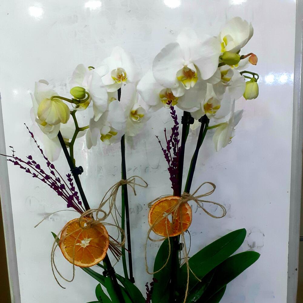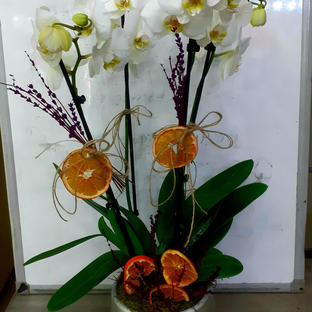 DEKORATİF SETAMİK SAKSIDA 3 DALLI BEYAZ ORKİDE VE 5 ADET LİM VE HASIR KURDALE DZAYN
