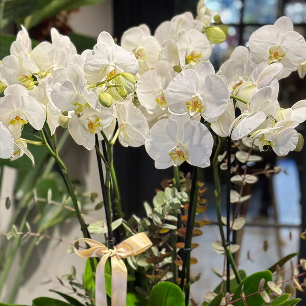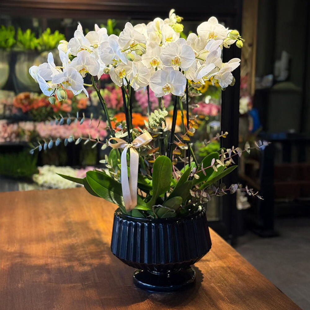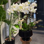 Siyah cam bir vazoda şık bir orkide düzenlemesi, üç çift köklü orkide (toplam altı sap) dekoratif yapraklarla süslenmiş.