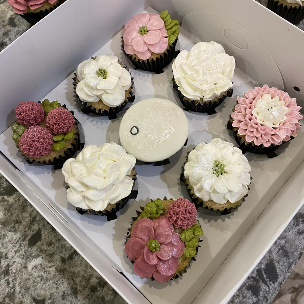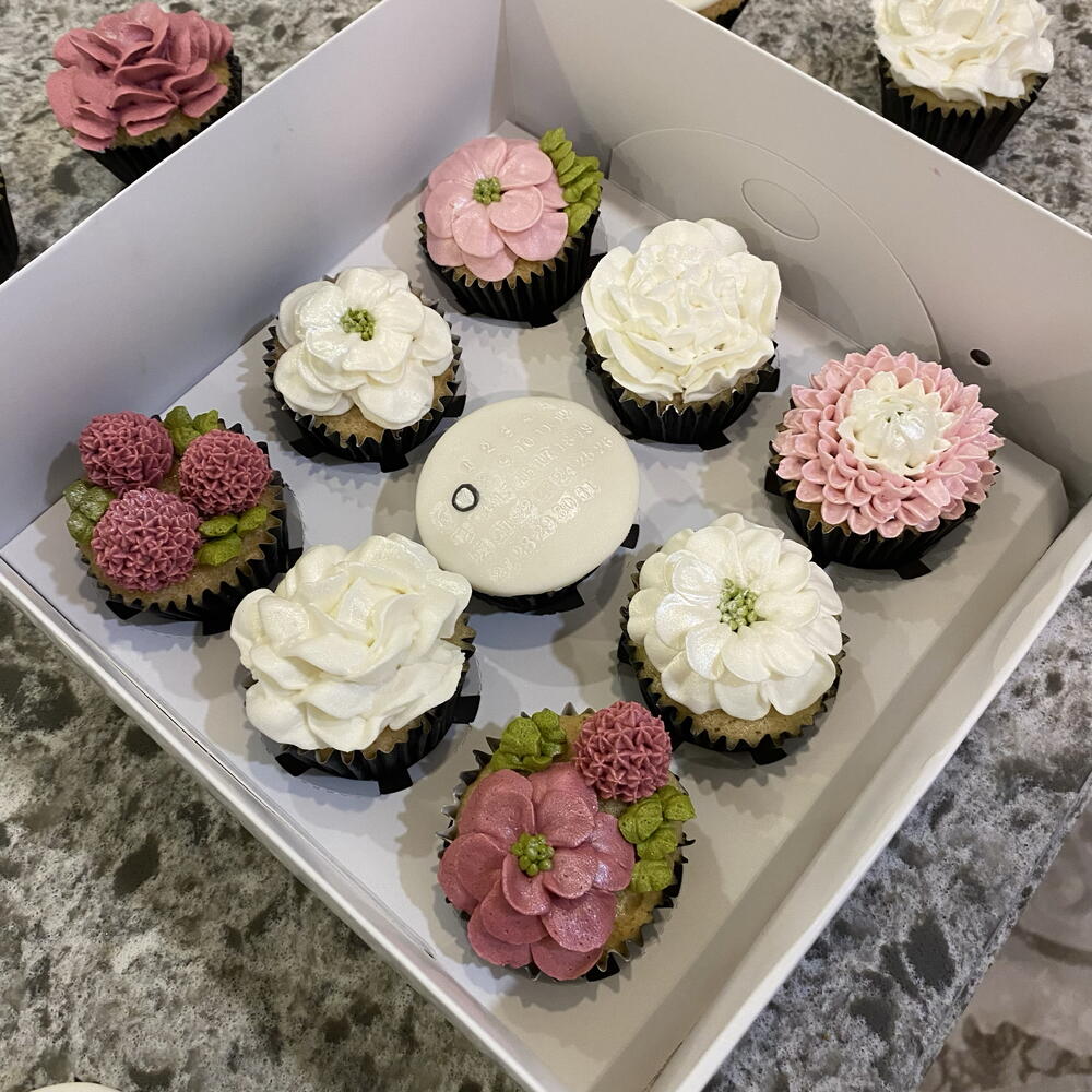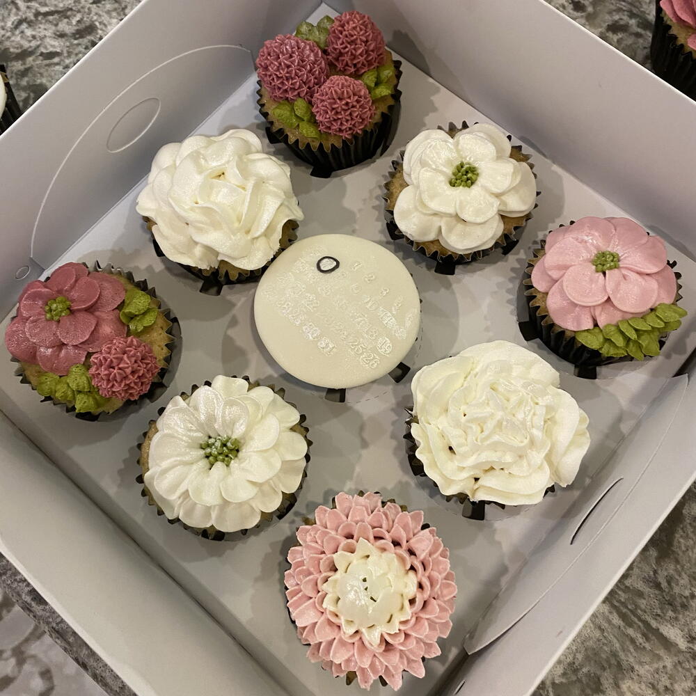 В коробке 9 капкейков. Цвета и виды цветов можно подобрать по желанию. Можно добавить изображение и текст. Можно заказать для особых случаев. - Цвета и разновидности цветов можно настроить по вашему вкусу. Можно добавить изображения и текст. Подходит для особых случаев. В коробке 9 капкейков.