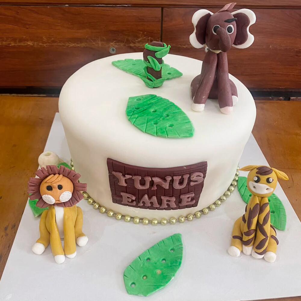 Этот милый торт с фигурками животных — отличный выбор для детей! Украшения в виде слона, льва, жирафа и листьев создают полностью естественную тему. Надпись YUNUS EARE на торте делает этот особый момент ещё более значимым. Торт, покрытый белой сахарной мастикой, украшен цветными фигурками из сахарной мастики. Этот торт — идеальный выбор для детских дней рождения, праздников и вечеринок; для любителей сахарной мастики он и эффектный, и вкусный.