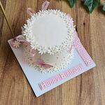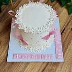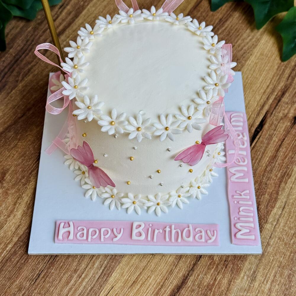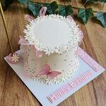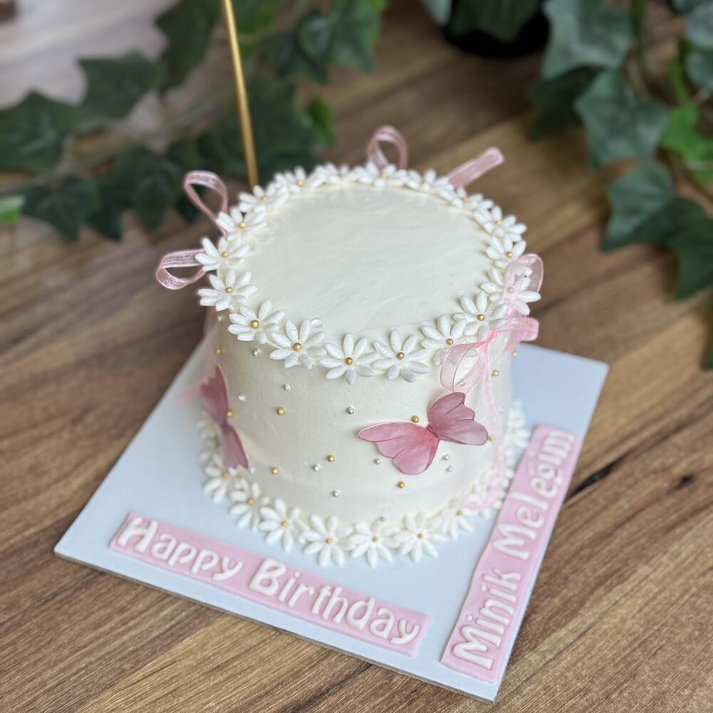 Он покрыт белым шоколадным кремом из сливочного сыра. Ромашки сверху сделаны из сахарной пасты и съедобны. Золотые жемчужины сделаны из съедобного сахара. Бабочки сделаны из вафельной бумаги и съедобны. Цвет ленточки можно изменить. *мука, молоко, сахар, масло, соль, крахмал, яйца, разрыхлитель, белый шоколад и сливочный сыр.