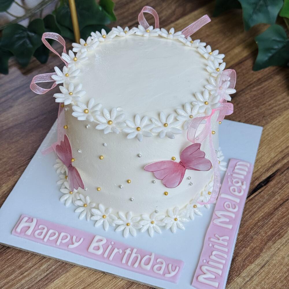 Этот элегантный бенто-торт, покрытый белым шоколадом и кремом из лабне, — свежий и вкусный выбор. Украшен сладкими съедобными ромашками из сахарной мастики и эффектными золотыми сахарными бусинками. Кроме того, бабочки на торте выполнены из съедобной вафельной бумаги. Цвет ленточки, придающей изделию изящный вид, можно изменить по вашему желанию. Этот торт представляет собой совершенное лакомство, которое в каждой детали похоже на произведение искусства и по вкусу так же впечатляет, как и по внешнему виду.