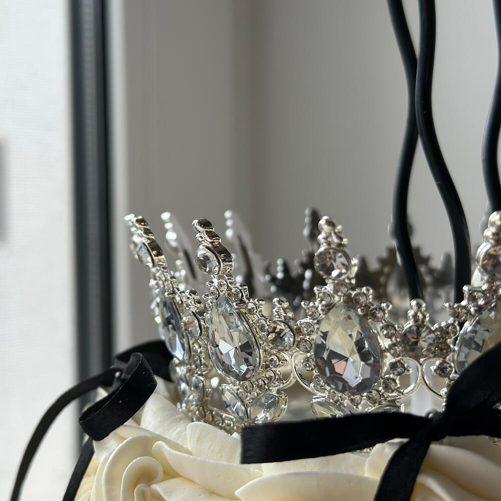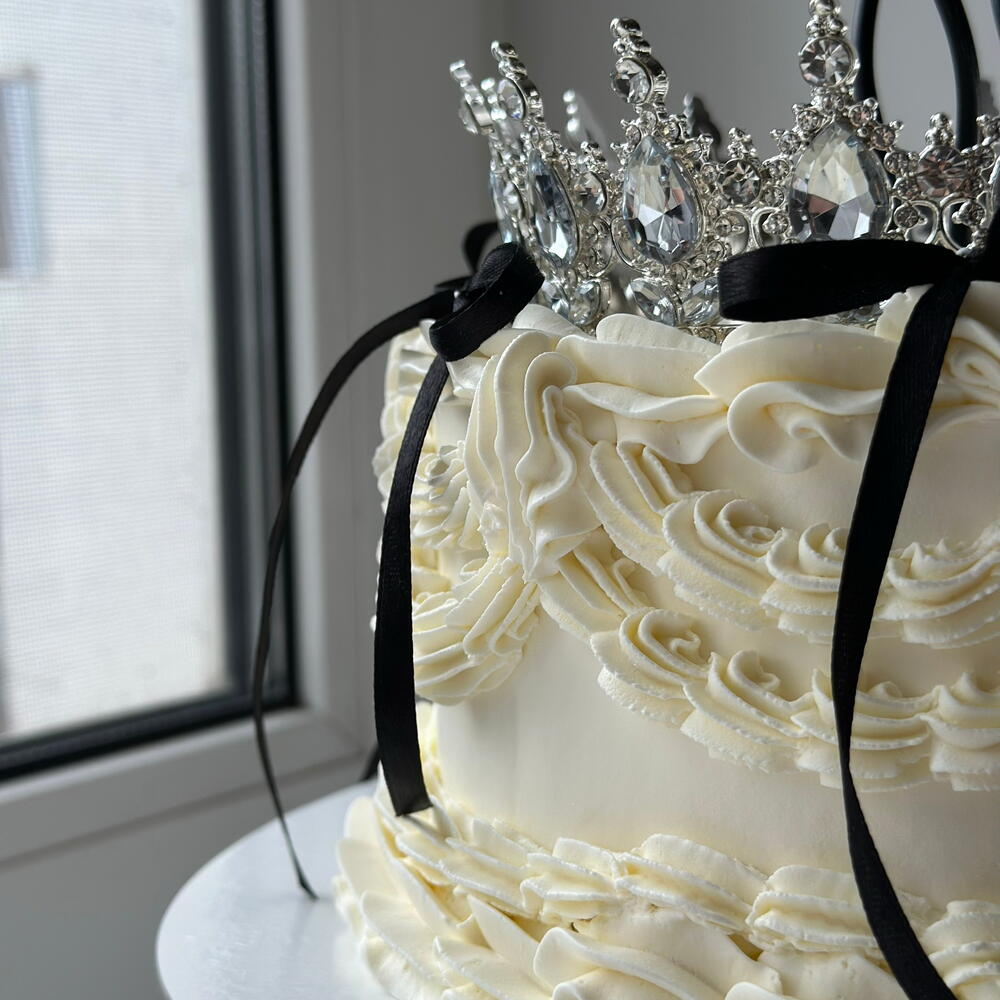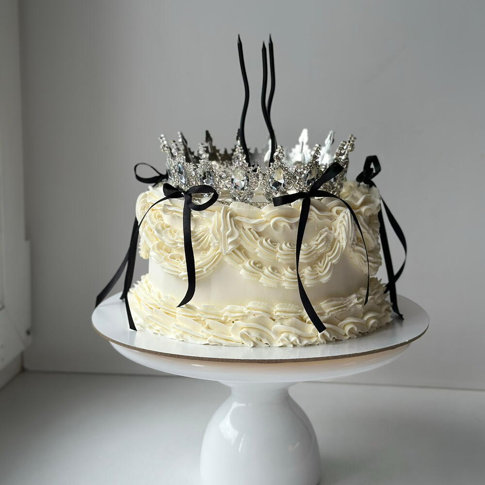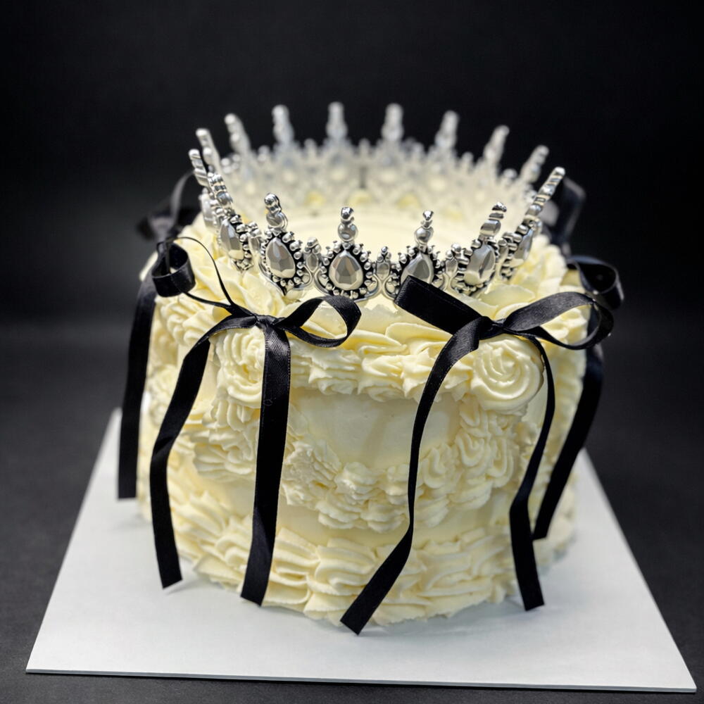 Vintage kraliyet tarzında dekore edilmiş şık bir kutlama pastası. Pürüzsüz krema kaplaması, zarif krema detayları ve siyah saten fiyonklar pastaya sofistike bir kontrast katarken, üst kısmındaki gösterişli taç pastaya gerçek bir kraliçe havası verir. Doğum günleri, özel kutlamalar ve lüks organizasyonlar için mükemmel bir seçimdir. Her pasta el yapımı olarak hazırlanır ve isteğinize göre premium iç dolgu seçenekleriyle kişiselleştirilebilir.