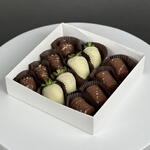 Strawberries, Dates Banana in Milk and White Belgian Chocolate Fresh strawberries, selected premium dates, and ripe banana slices coated in smooth milk and creamy white Belgian chocolate. A delicate and well-balanced combination of fruity freshness and soft sweetness. Beautifully presented and perfect as a gift or an elegant addition to a flower arrangement.