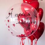 1 большой пузырьковый шар, на который можно написать любой текст, 9 красных фольгированных сердечных шаров.