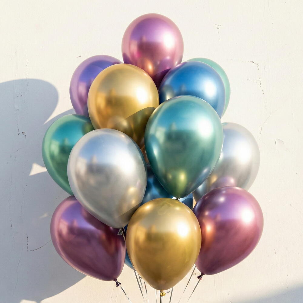 Этот изящный и привлекательный набор из хромированных фольгированных шаров - отличный выбор для любого праздника или особого мероприятия. Шары с блестящими и металлическими поверхностями придадут вашему пространству изысканность. Гармоничное сочетание золотого, серебряного, зеленого, фиолетового, синего и розового цветов создает визуальное богатство и элегантность. Эти шары идеально подходят для дней рождения, свадеб, выпускных вечеров или новогодних мероприятий, добавляя веселье и цвет вашему месту. Советы по уходу: Хромированные фольгированные шары обычно долговечны. Однако следует избегать прямых солнечных лучей и чрезмерной жары. После надувания шаров старайтесь слегка не сжимать их. После использования шары можно аккуратно спустить и сохранить. Также избегайте влажных мест, так как в таких условиях шары могут быстро сдуваться.