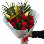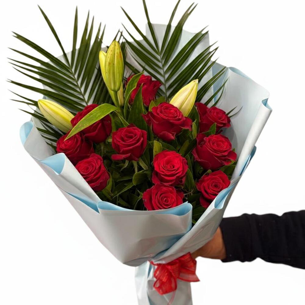 Этот букет из 11 красных роз и лилий, мощно выражающий любовь и страсть, тщательно составлен для особых случаев. Одиннадцать ярких, свежих красных роз дополнены бутонами лилий, декоративными пальмовыми листьями и зеленью, представлен в современной бело-голубой упаковке с красной лентой. Его богатый и эффектный дизайн делает его идеальным подарком на День святого Валентина, годовщину, день рождения, предложение руки и сердца или другие особые сюрпризы. Элегантность классических красных роз создает незабываемое впечатление.