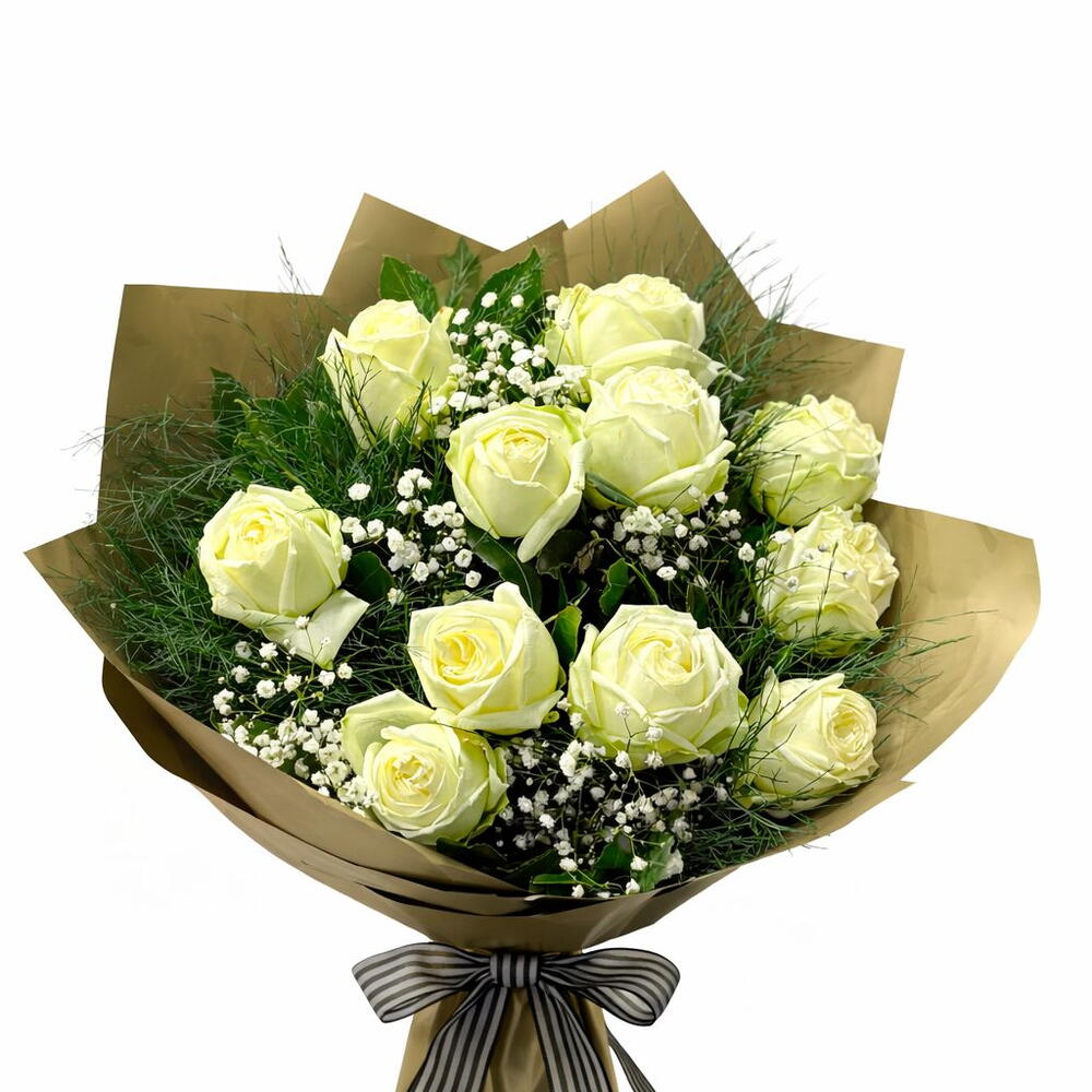 Символ чистоты и изящества — букет из 11 белых роз, дополненный гипсофилой и пышной зелёной зеленью. Элегантная упаковка в золотистых тонах и изящная лента делают его незабываемым подарком для особых случаев. Впечатляющий выбор на день рождения, годовщину, в знак благодарности и для всех особых моментов. С опцией доставки в тот же день доставляется вашим близким свежим и с заботой.