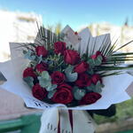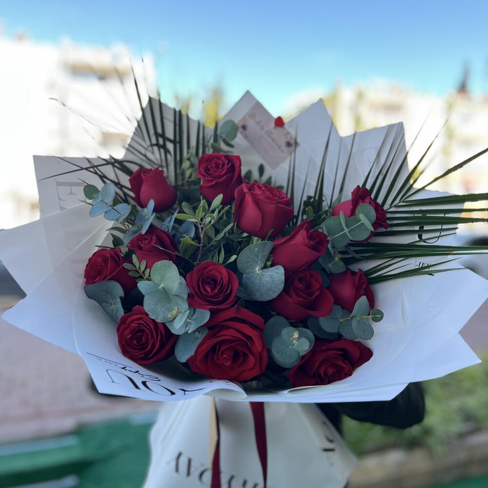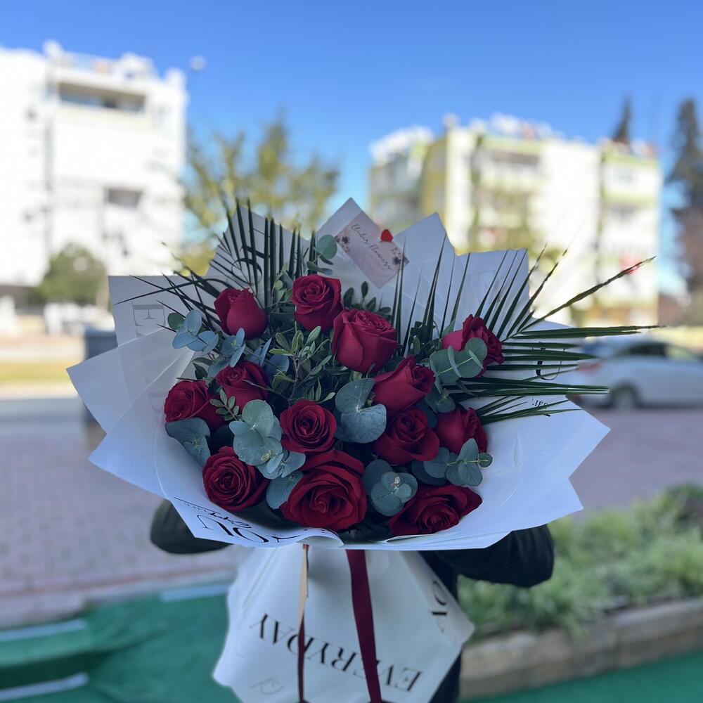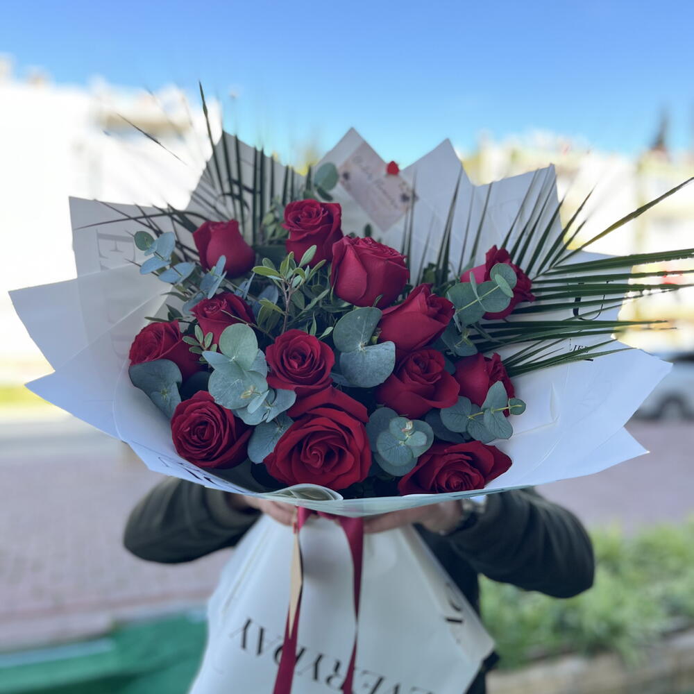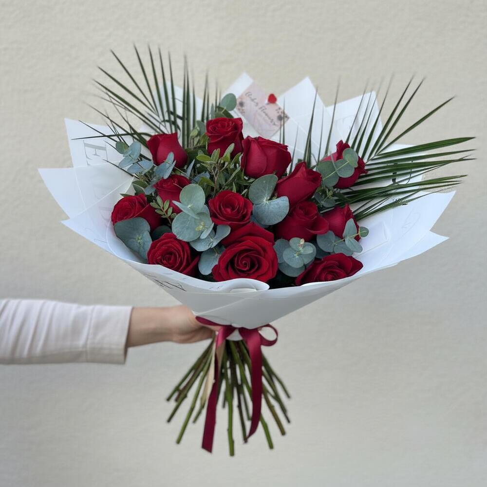 Этот букет из красных роз, символизирующий любовь и изящество, создан, чтобы сделать ваши особенные моменты незабываемыми. Неподражаемая красота ярко-красных роз в сочетании с натуральной текстурой листьев эвкалипта и благородным видом экзотических пальмовых листьев создает захватывающее гармоничное сочетание. Выделяющиеся характеристики: • Красные Розы: Самый мощный символ страсти и любви • Листья Эвкалипта: Освежающее и современное прикосновение • Листья Пальмы: Элегантный и выразительный вид • Особая Упаковка: Изящная белая бумага и стильная лента для декора Этот особенный букет идеально подходит для Дня святого Валентина, годовщины, дня рождения или просто чтобы сделать вашего любимого человека счастливым. Закажите сейчас и выразите свою любовь самым красивым способом!