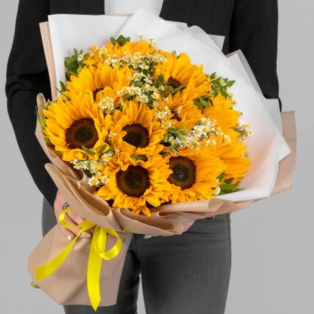 Этот изящный букет цветов украшен 15 подсолнухами, символизирующими тёплоту и энергию солнца, 5 веточками мини-ромашек, олицетворяющими невинность и чистоту природы, и 4 веточками зелени, отражающими свежесть природы. Перенесите красоту и свежесть вашего сада в интерьер. Подарите этим великолепным букетом радость и счастье своим близким или сделайте ваши особые дни ещё более праздничными.