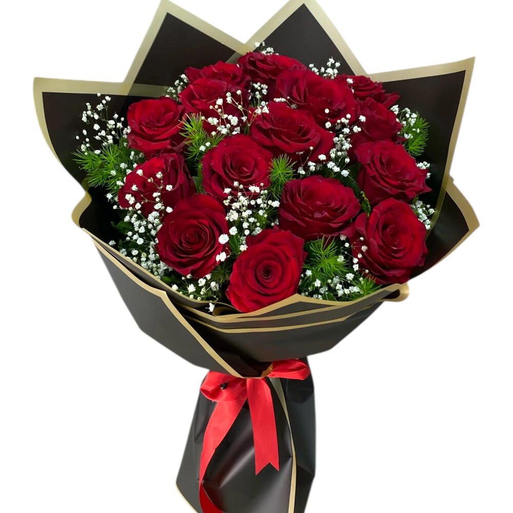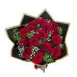 красная роза - 15 шт. гипсофила - 3 шт. натуральная зелень - 3 шт.