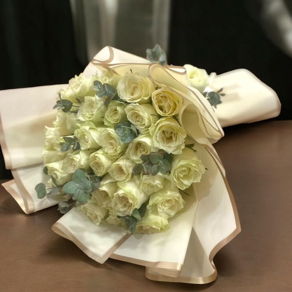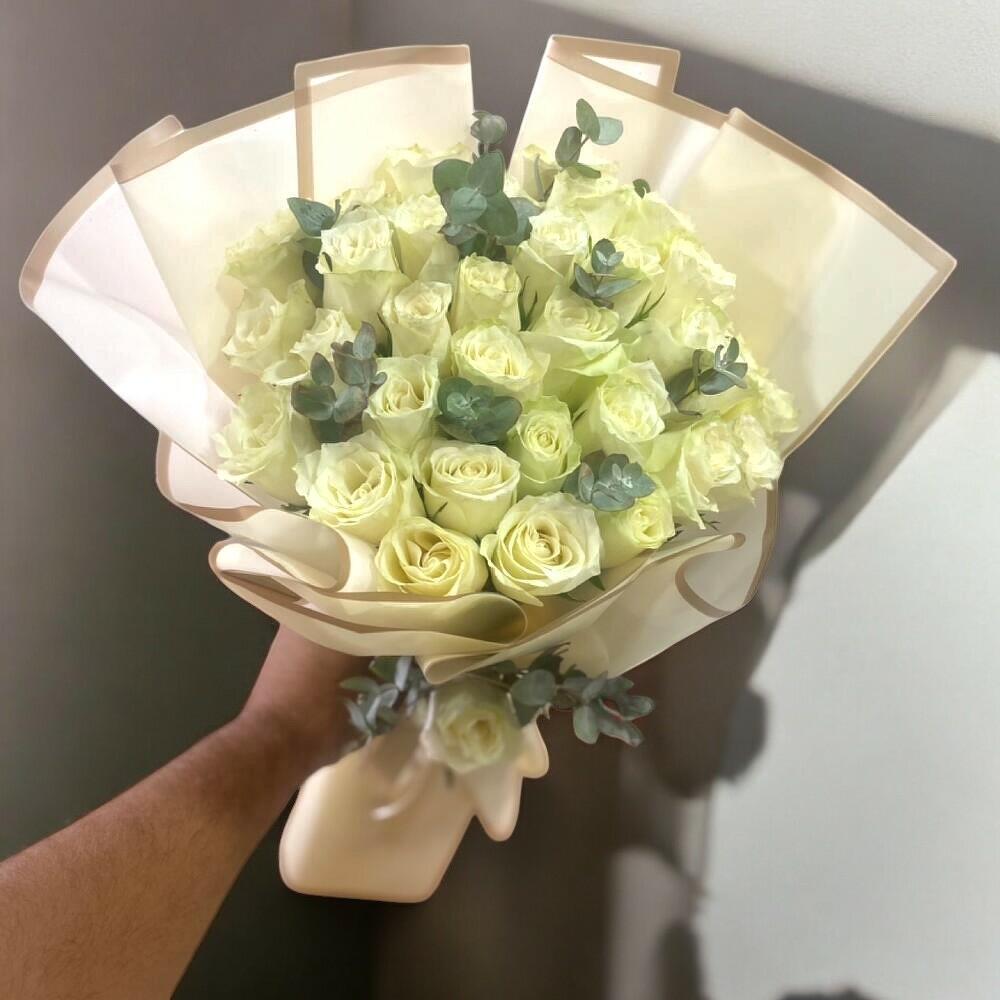 Этот очаровательный букет белых роз олицетворяет чистоту и изящество любви. Романтический подарок, дополненный успокаивающими своей естественностью листьями эвкалипта, поможет вам выразить чувства самым стильным и впечатляющим образом. Рекомендации по уходу: Чтобы ваши розы дольше сохранялись, ежедневно обрезайте стебли на 1-2 см и меняйте воду. Держите букет вдали от прямых солнечных лучей и тёплых помещений, чтобы он дольше оставался свежим.