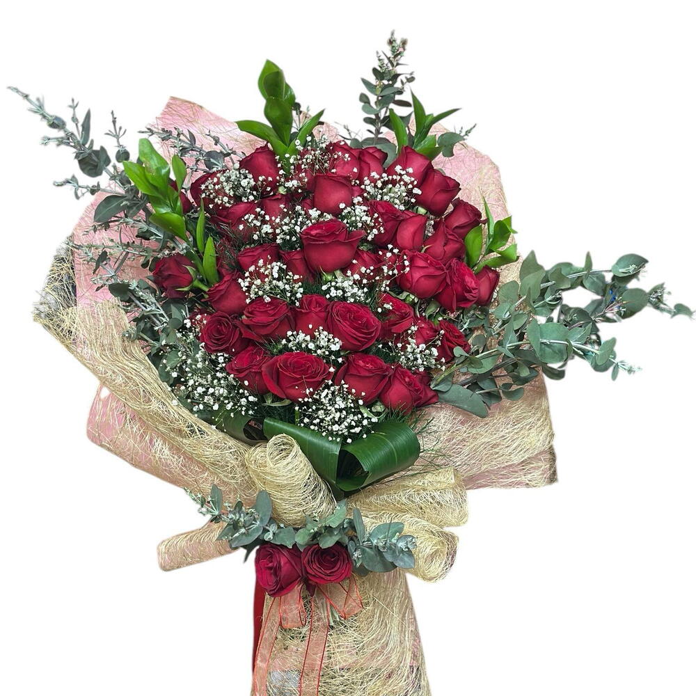 Красные розы, самое впечатляющее выражение любви, страсти и сильных эмоций, представлены в этом специально созданном букете с ослепительной элегантностью. 41 свежая красная роза тщательно скомпонована с гипсофилой и декоративной зеленью и дополнена упаковкой из натуральной абаки. Объемная структура и богатые детали создают роскошный и впечатляющий вид. Этот особенный букет идеально подходит для Дня святого Валентина, годовщин, предложений руки и сердца, дней рождения или любого незабываемого сюрприза. Естественная элегантность упаковки из абаки и благородство красных роз объединяются, создавая вневременной дизайн. Примечание: В связи с сезонными условиями и наличием товара возможны незначительные вариации в цветочных композициях и деталях упаковки. Общий дизайн и стандарты качества продукта сохраняются на протяжении всего процесса подготовки.