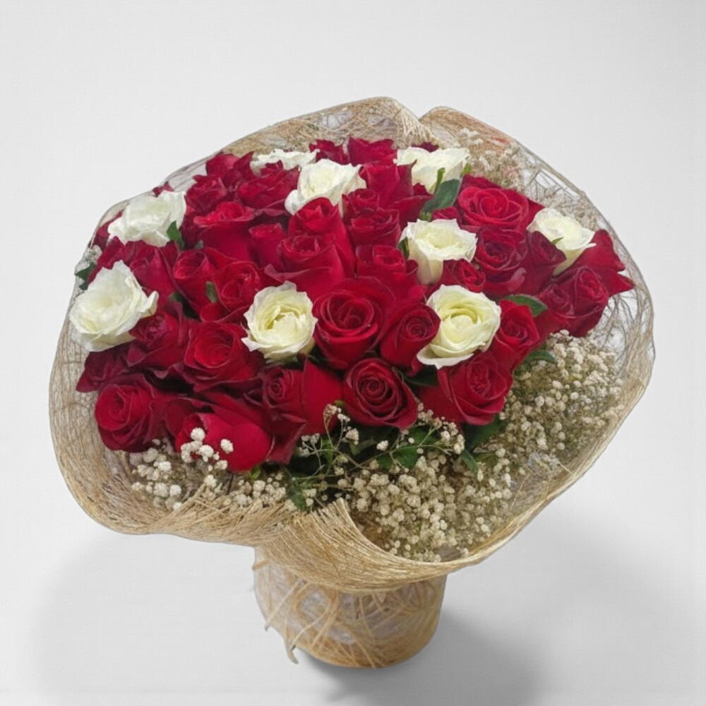 Этот стильный букет, созданный в завораживающем контрасте красных и белых роз 🌹, одновременно отражает страсть любви и изящество невинности. Упаковка со соломенной фактурой придаёт натуральное тепло и деревенскую элегантность. Эта композиция, в которой продумана каждая деталь, является незабываемым подарком на День святого Валентина, годовщину или особые торжества. Чтобы сохранить свежесть роз, перед тем как поставить их в воду, обрежьте кончики стеблей примерно на 1 см и меняйте воду каждые два дня.