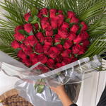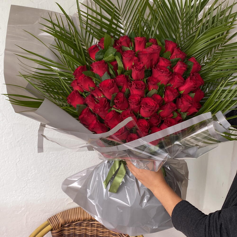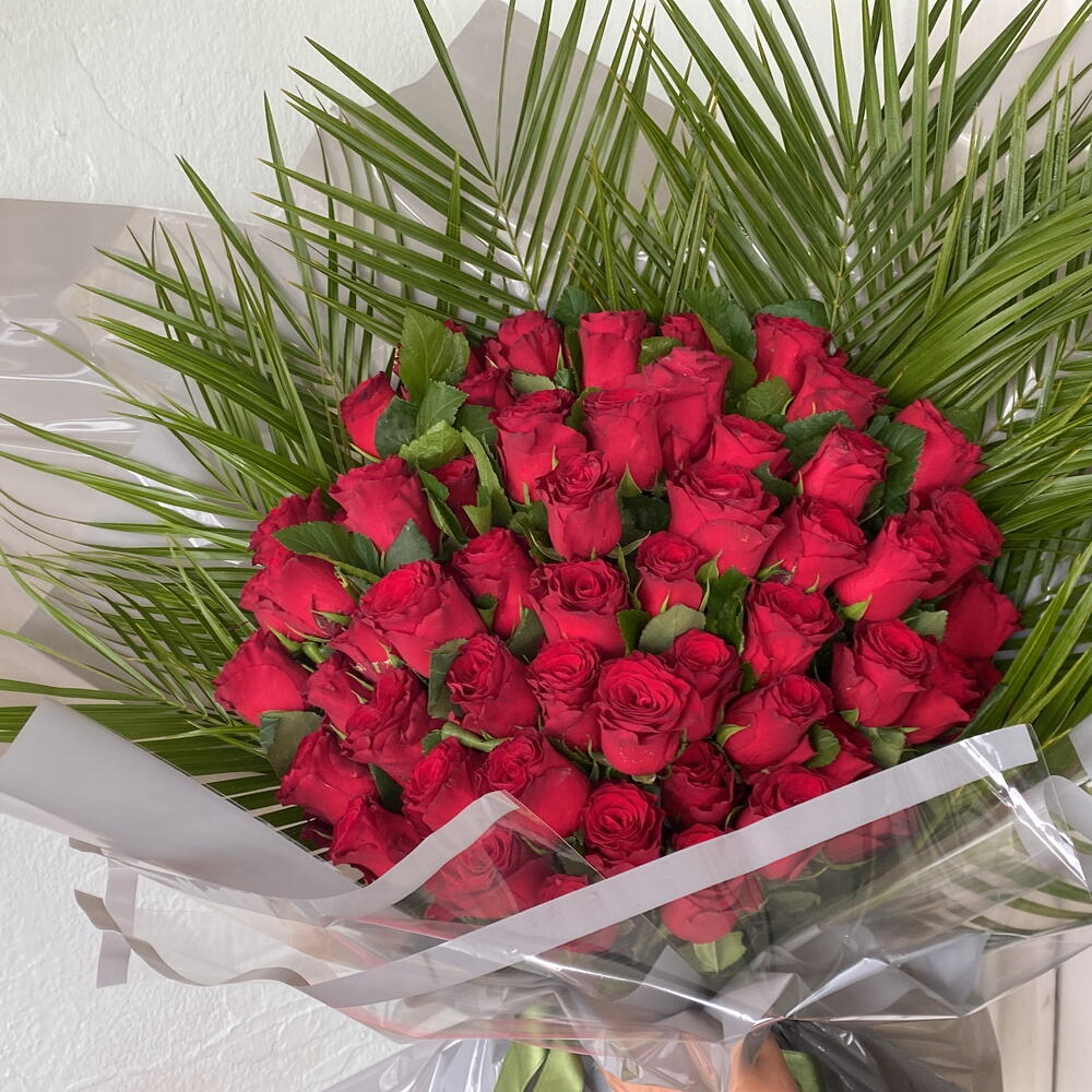 Этот роскошный и романтичный букет цветов состоит из 50 живых красных роз и 5 листьев пальмовой зелени. Красные розы — символ любви и страсти, поэтому этот букет — отличный способ выразить своим близким глубокую любовь и чувства. Зелёные пальмовые листья подчёркивают живость и свежесть букета. Эта изящная цветочная композиция подходит как для современного, так и для классического образа жизни. Вот идеальный подарок на день рождения, годовщину или помолвку.