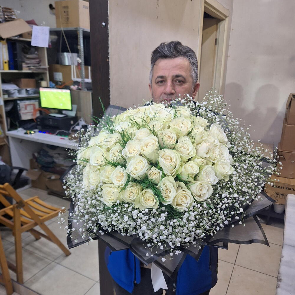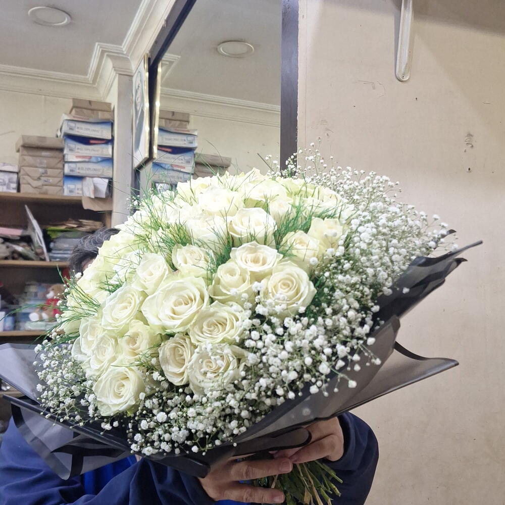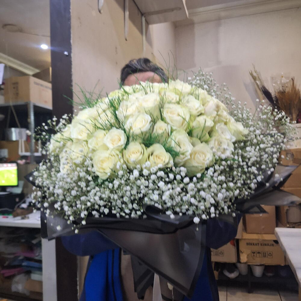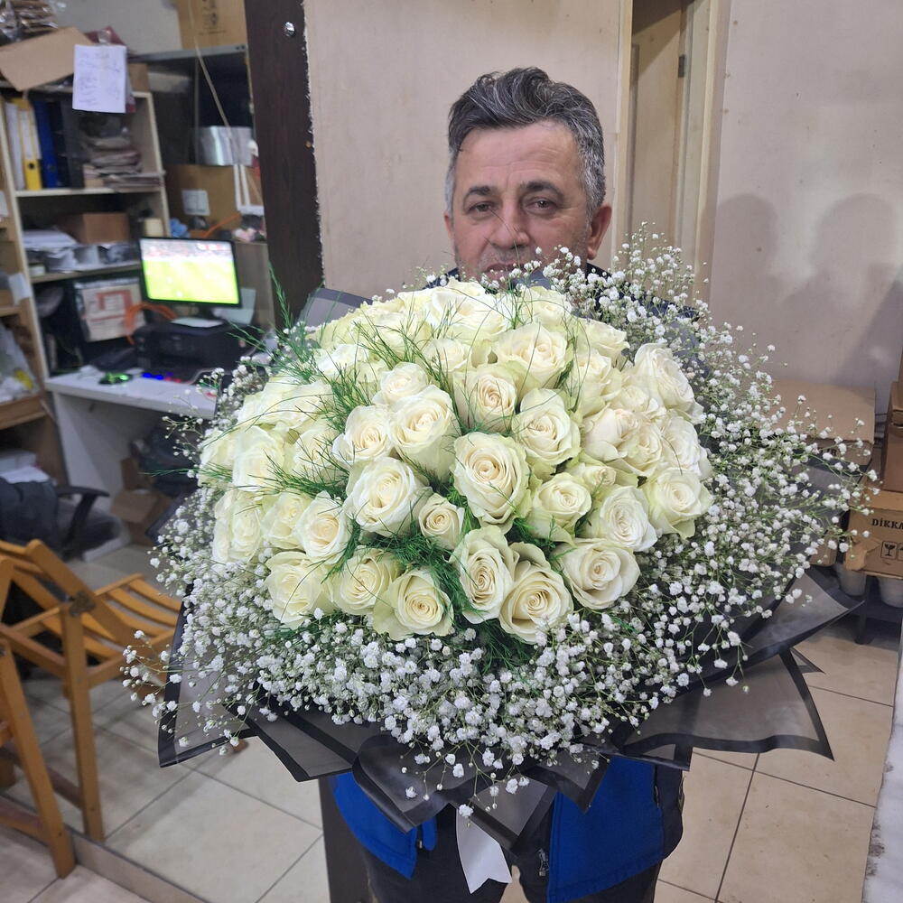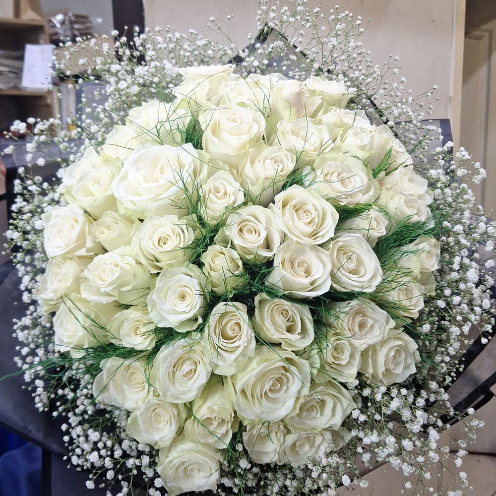 Этот очаровательный букет состоит из 55 импортных роз, 55 белых роз и гипсофилы. Благодаря своему элегантному дизайну и внешнему виду этот букет — идеальный способ показать любимым, как сильно вы их цените. Благодаря своему неповторимому аромату и элегантному виду этот букет сделает бесчисленные особенные моменты ещё более запоминающимися. Поистине впечатляющий подарок.