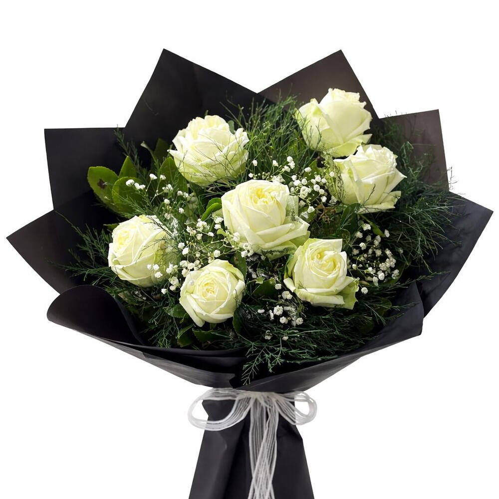 Символ чистоты и изящества — 7 белых роз, аккуратно оформленных с гипсофилой и зелёной зеленью. Стильная чёрная упаковка и изящная лента делают его эффектным подарком для особых случаев. Это премиальный выбор для дня рождения, годовщины, благодарности и всех особых моментов. При выборе опции «доставка в тот же день» доставляется вашим близким свежим и с заботой.
