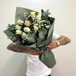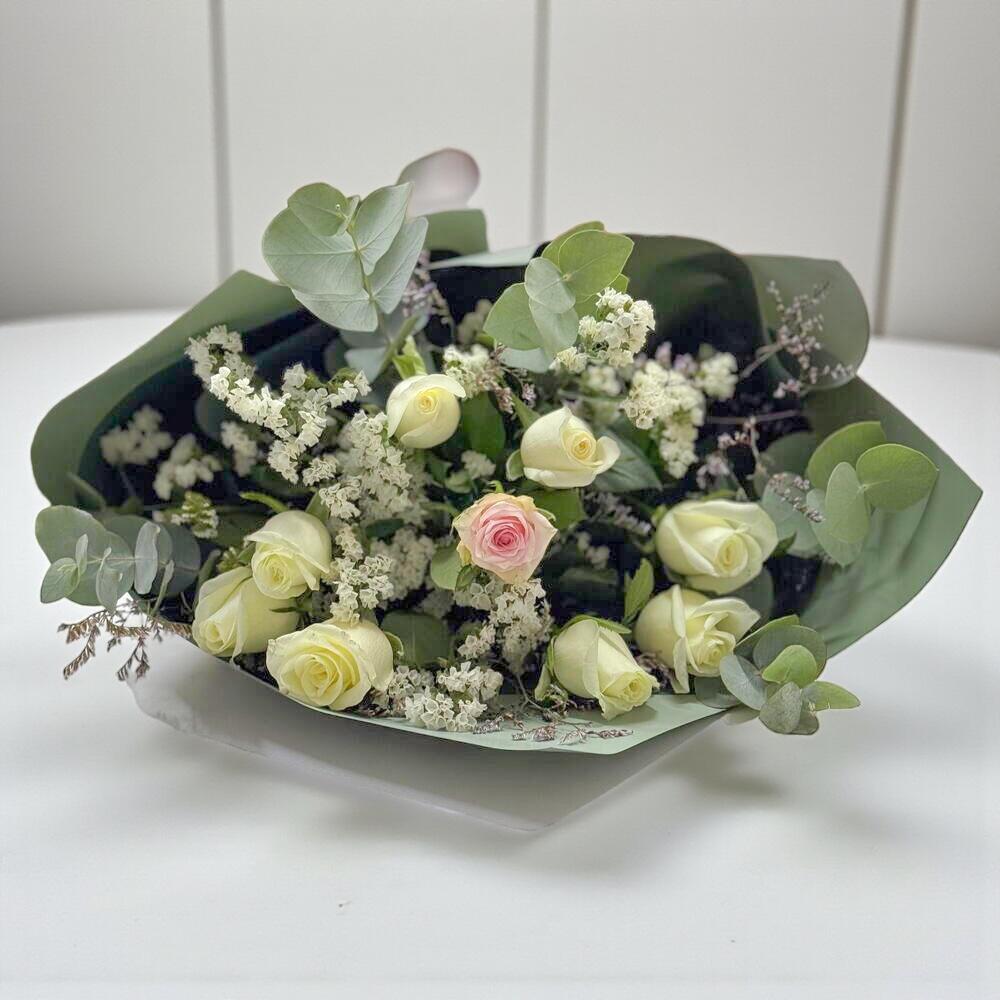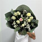 Букет Белая элегантность – эвкалипт и белые розы с розовым оттенком