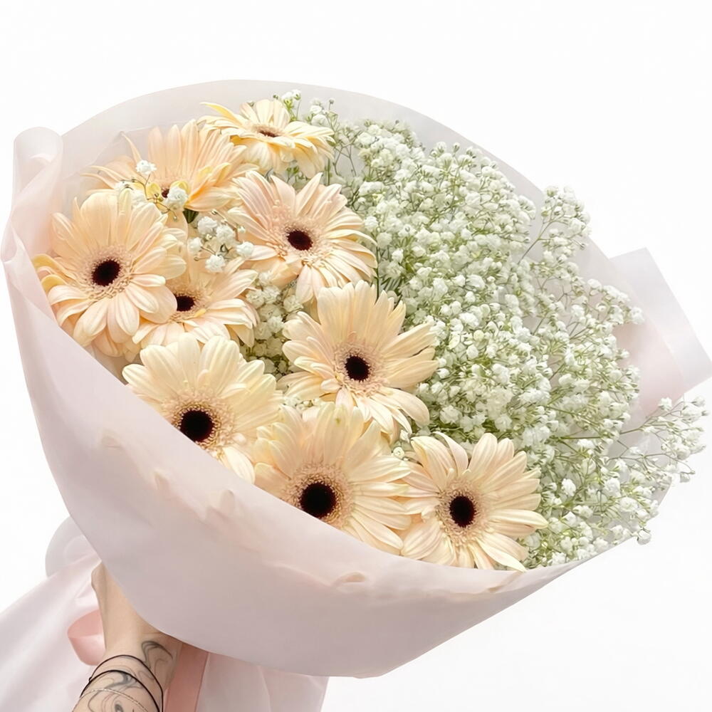 Белая гербера и гипсофилы в белой упаковочной бумаге.