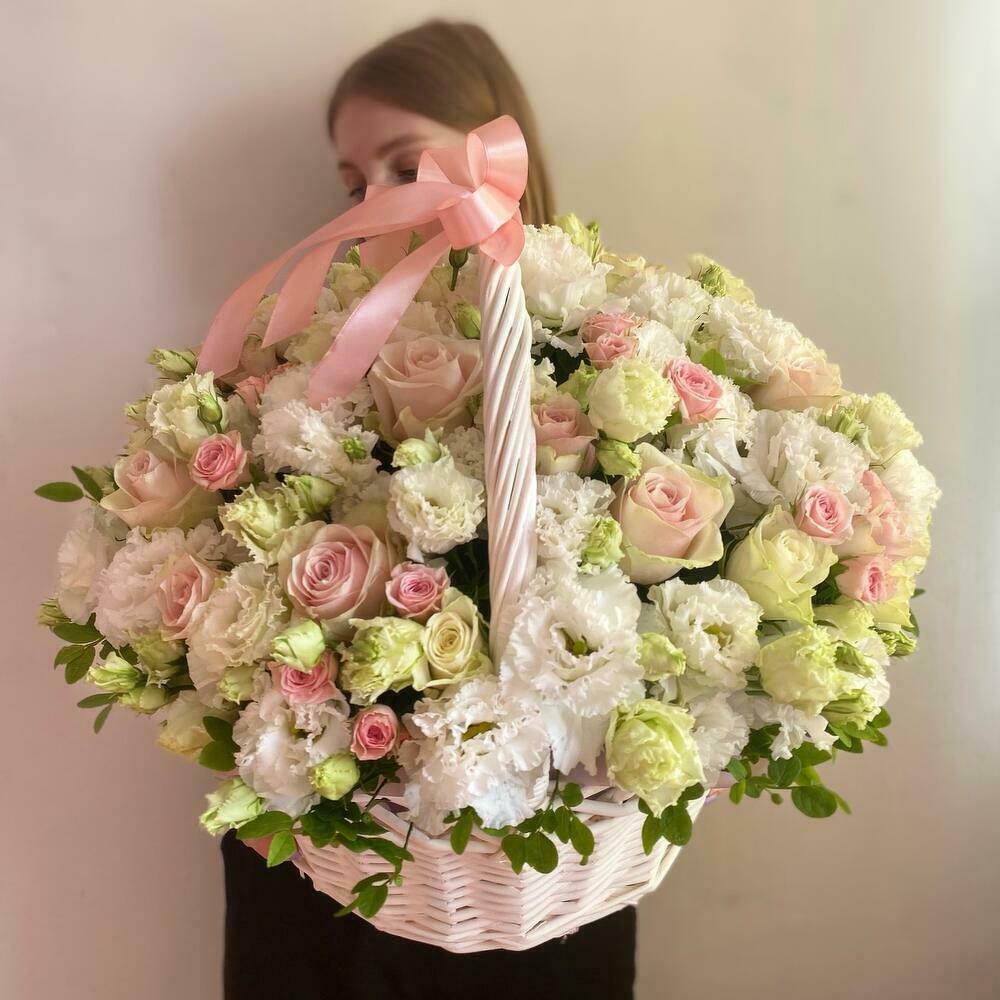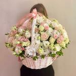 Идеальное сочетание изысканности и романтизма! Розы в мягких пастельных оттенках розового и кремового цвета символизируют чистую любовь и нежность, а белые цветы лизиантуса добавляют изысканности и элегантности. Пышные белые гвоздики усиливают великолепие букета, а свежие зеленые листья придают естественность и живость. Это очаровательное композиция идеально подходит для того, чтобы сделать особенные дни незабываемыми! 💕 Подарите своим близким на день рождения, годовщину или просто как знак любви Пастельную Мечту в Цветочной Корзине, которая своим изысканным дизайном поражает воображение.