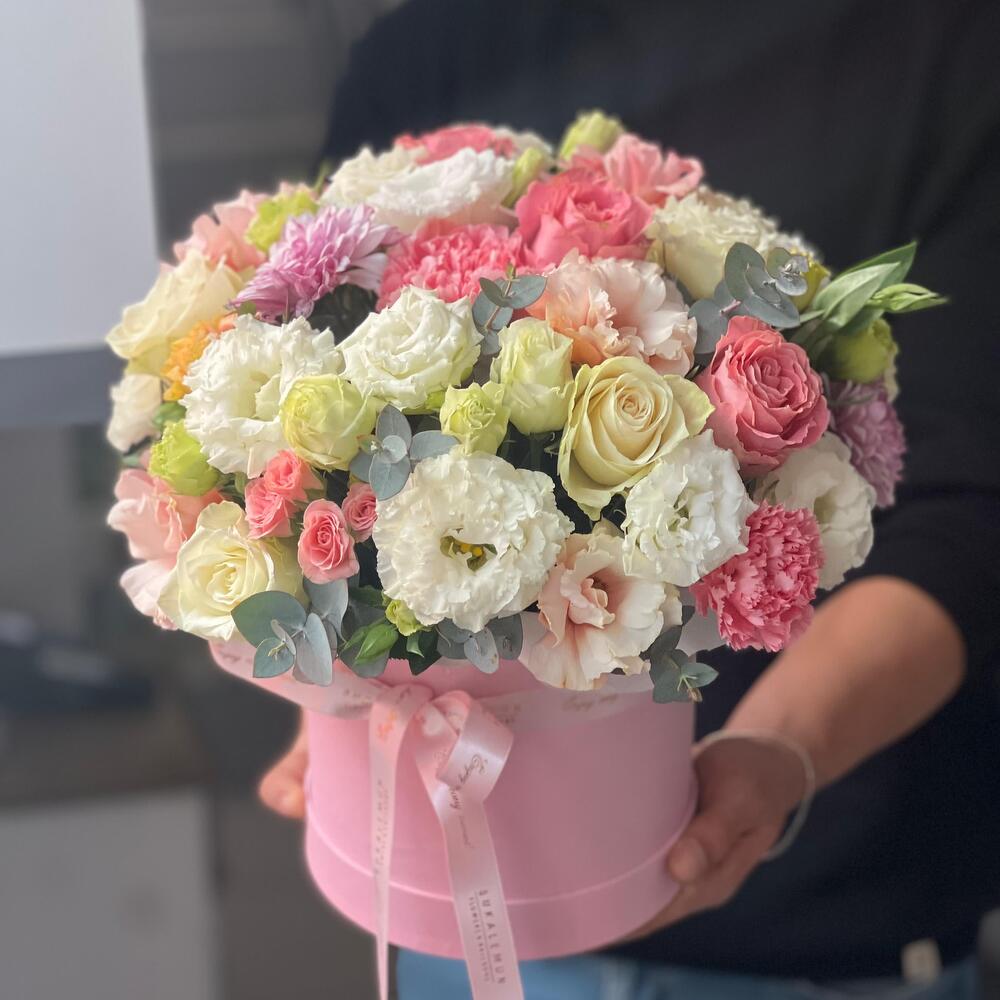 Этот уникальный набор в коробке представляет собой утончённый и стильный образ. Изысканное сочетание 5 нежных розовых роз и 5 элегантных белых роз создаёт красочную палитру. 5 роскошных спрей-роз придают композиции изысканность. 7 романтических эустом и 6 эвкалиптов вносят живость в уникальность букета - настоящее произведение искусства! Неотразимое очарование и декоративность представлены 3 хризантемами и 5 очаровательными диантусами. Этот букет — идеальный выбор, чтобы подарить любимому человеку частичку вашей любви и восхищения.