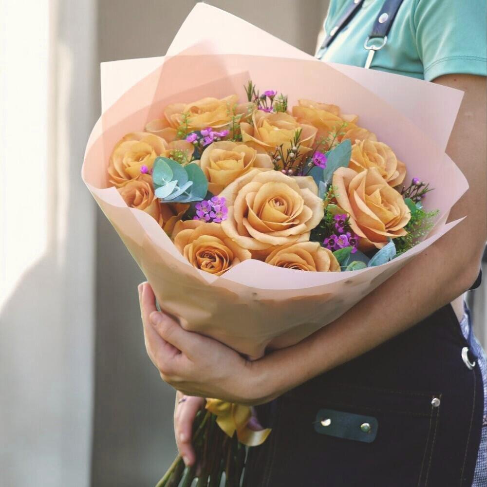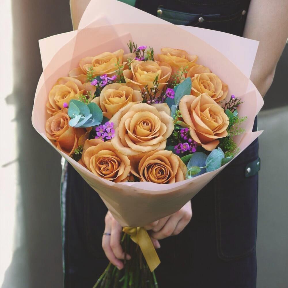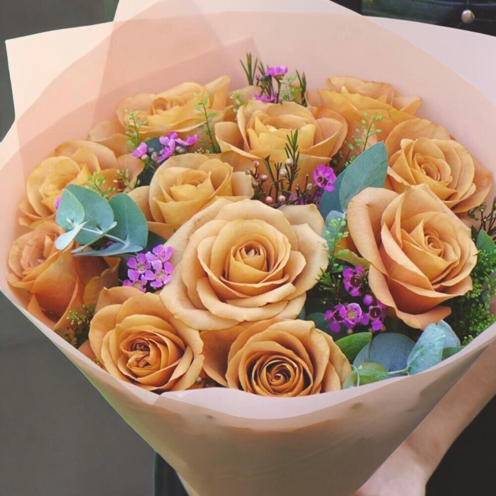 Elegant and timeless, this bouquet of rich caramel-toned roses is perfect for conveying warm emotions and gratitude. Delicately arranged with sprigs of soft eucalyptus leaves, it strikes a beautiful balance between bold and delicate. Whether youre celebrating a special moment or simply surprising someone dear, this bouquet is sure to make a lasting impression. To keep your flowers fresh longer, trim the stems at an angle every 1–2 days and replace the water in the vase regularly. Avoid placing the bouquet in direct sunlight or near heat sources.