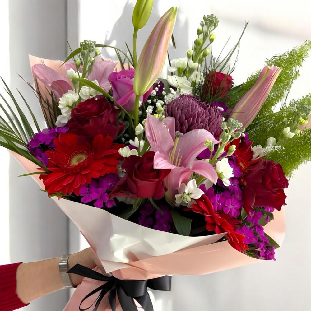 Этот букет, украшенный изысканными оттенками глубокого красного и пурпурного, произведёт впечатление в любой обстановке. Розы, лилии и красные герберы в этом дизайне сочетаются, создавая одновременно ослепляющую и романтичную атмосферу. Белые цветы в букете смягчают переходы между оттенками, обеспечивая изящный баланс. Содержащий самые прекрасные цвета природы, этот букет — прекрасный способ наилучшим образом выразить ваши чувства близким. Идеальный выбор для тех, кто ищет одновременно романтичный и эффектный подарок, этот букет увенчает каждый ваш особенный момент. Он сочетает классическую элегантность с современным штрихом.