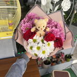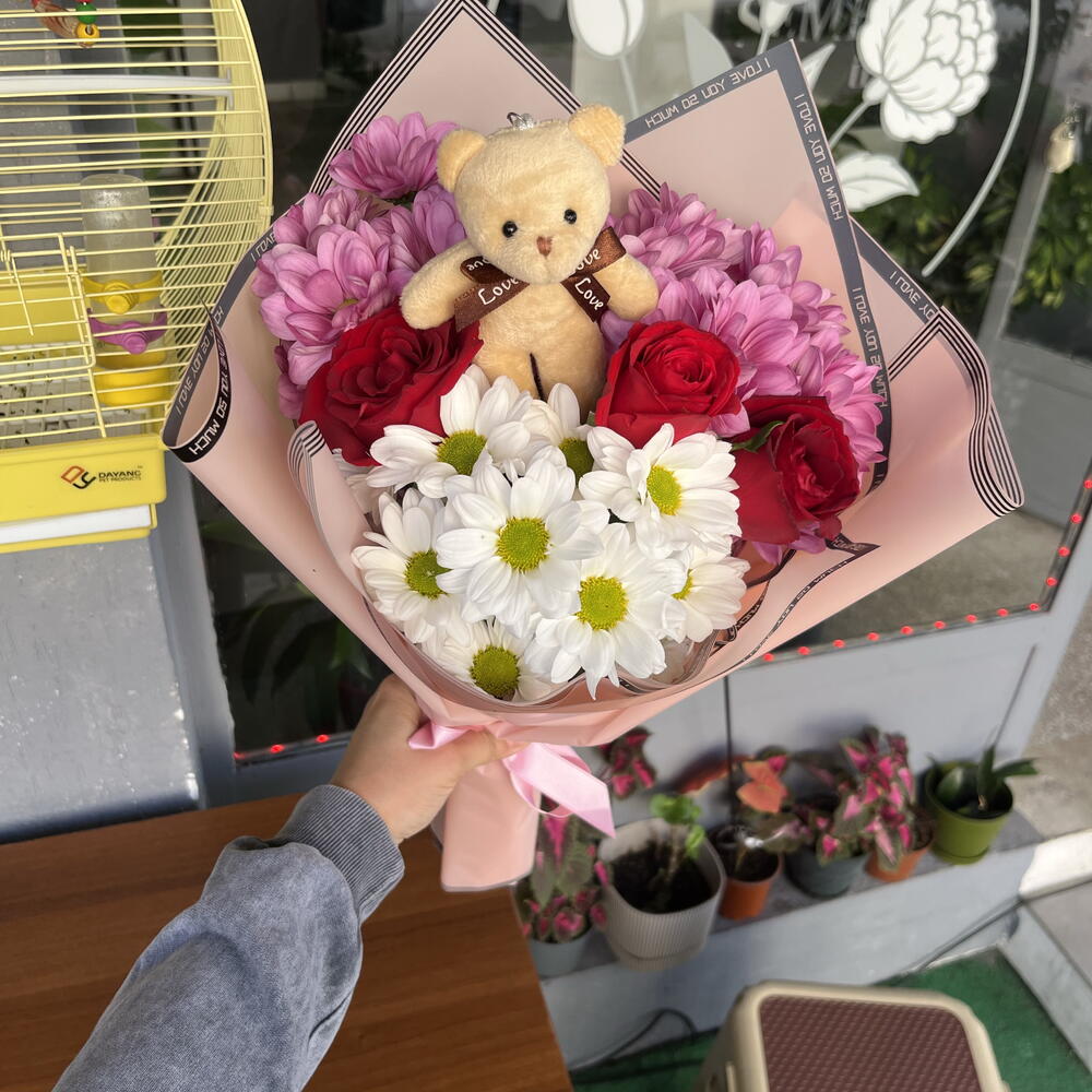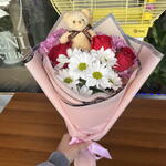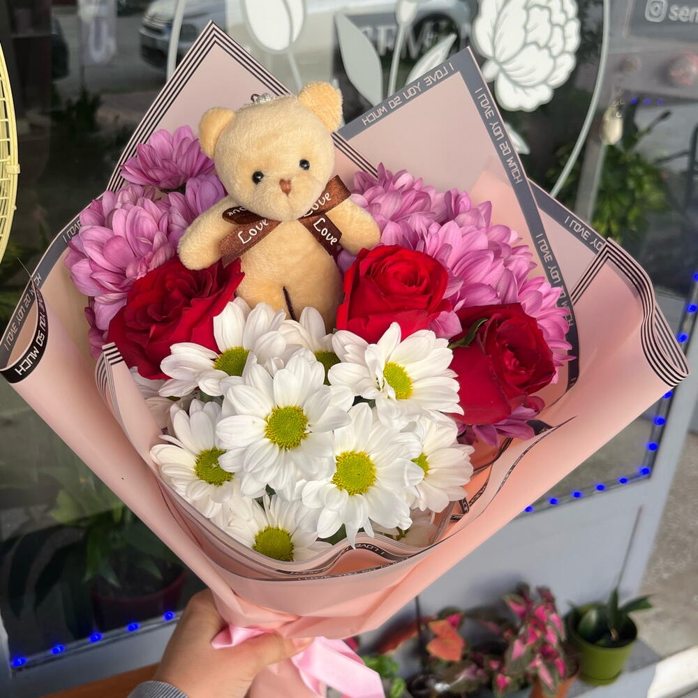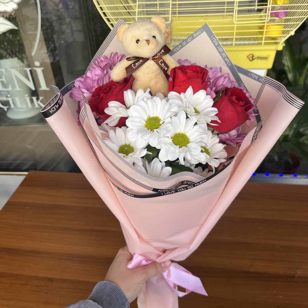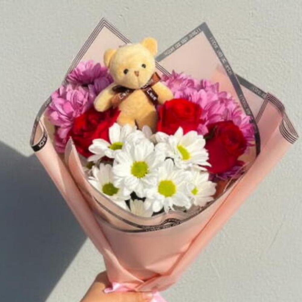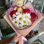 красная роза - 3 шт. белая ромашка - 5 шт. розовая ромашка - 10 шт. плюшевый мишка - 1 шт.