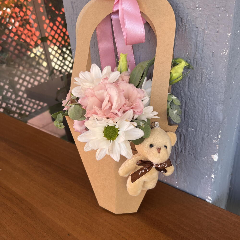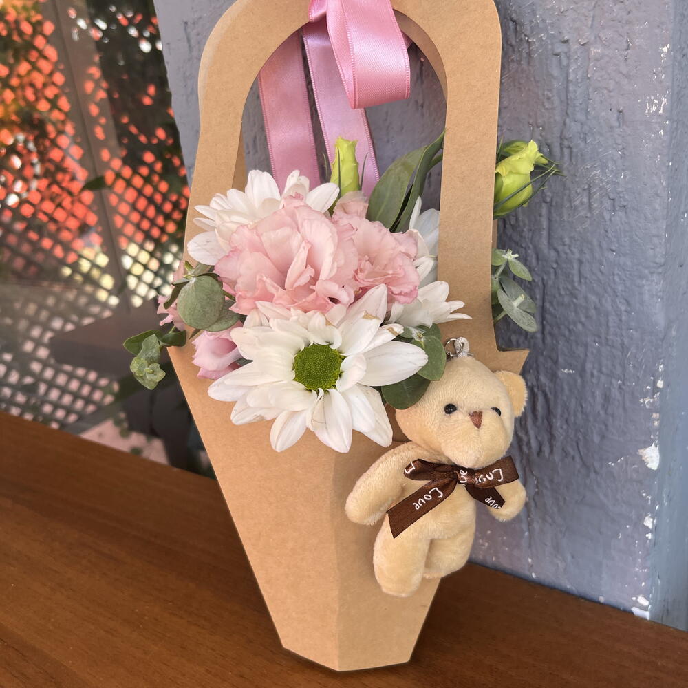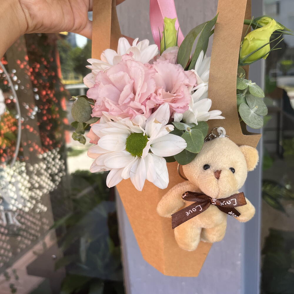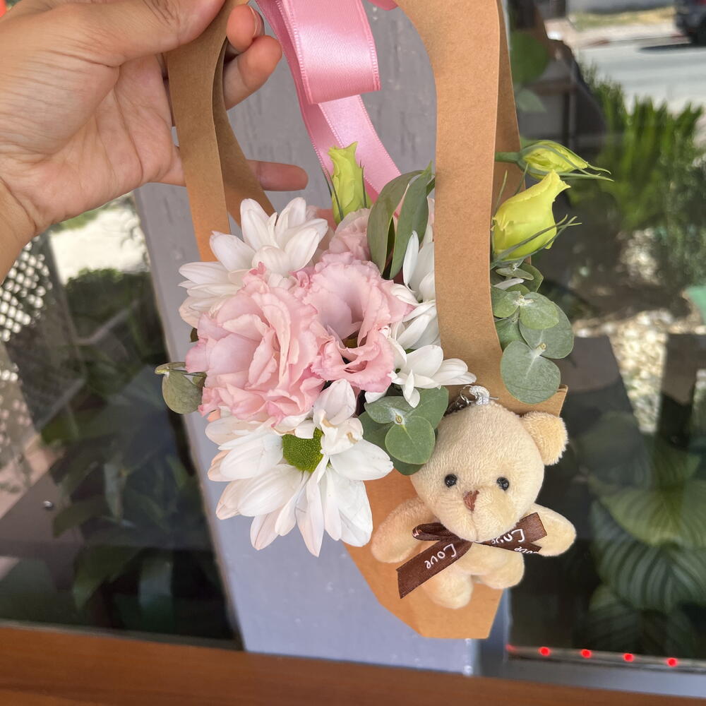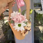 белая ромашка - 5 шт. эвкалипт - 4 шт. лизиантус розовый - 10 шт. маленький мишка - 1 шт.
