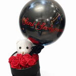 Siyah silindir kutu içinde seni seviyorum yazılı balon, ayıcık ve 7 adet yapay kırmızı gül aranjmanı.