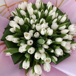 Букет «Белая весенняя мечта» — великолепный шедевр, созданный из чистых и изящных белых тюльпанов. Этот букет прекрасно отражает чистую красоту белого и свежесть весеннего воздуха. Цветы, представленные в элегантной обёртке нежно-розовых и золотистых тонов, создают ослепительный и стильный вид. Белые тюльпаны своим изящным строением придают любому пространству утончённый штрих. Этот букет — идеальный выбор, чтобы выразить глубинные чувства к близким и увенчать любой особый момент. Этот великолепный букет станет замечательным вариантом для свадеб, годовщин или особых праздников.