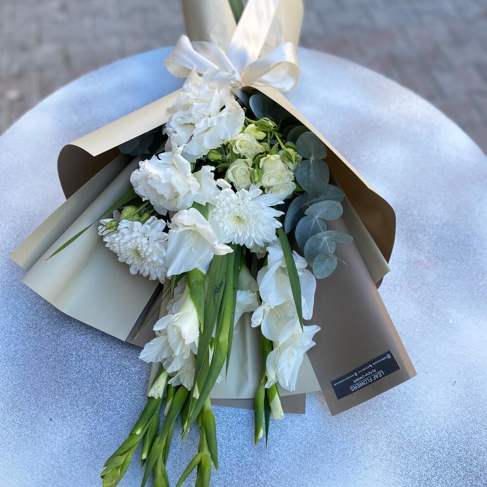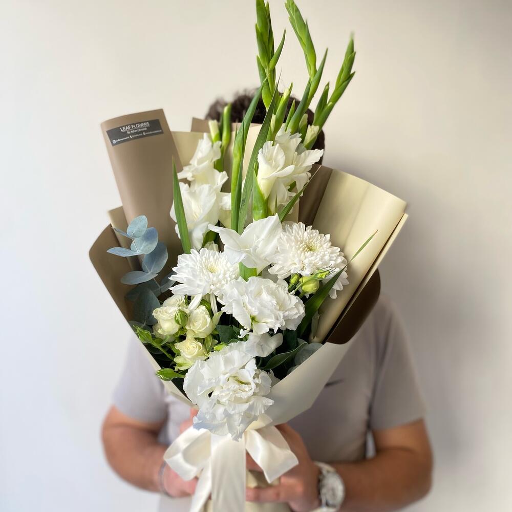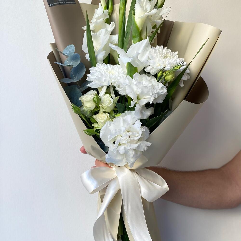 Белый смешанный букет с белыми гладиолусами