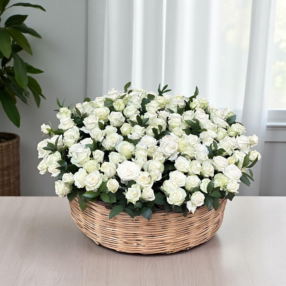 Великолепный букет из 151 аккуратно уложенных в корзине белых роз. Изысканная красота этих белых роз делает любой особый момент ещё более незабываемым. Будь то выражение любви близким или празднование особого дня, эти эффектные розы — идеальный выбор. Они несомненно придадут любому месту утончённость и элегантность.