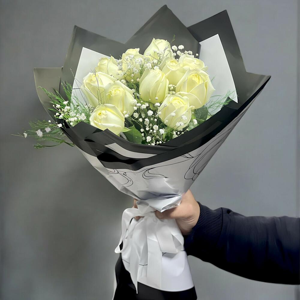 Этот изящный букет цветов тщательно составлен из 11 белых роз, символизирующих романтику и невинность, и 10 веточек гипсофилы, придающих свежесть. Это идеальное сочетание — превосходный выбор, чтобы отпраздновать важные моменты или показать близким, насколько они важны для вас. Этот впечатляющий букет цветов придаёт везде утончённую эмоциональную нотку.