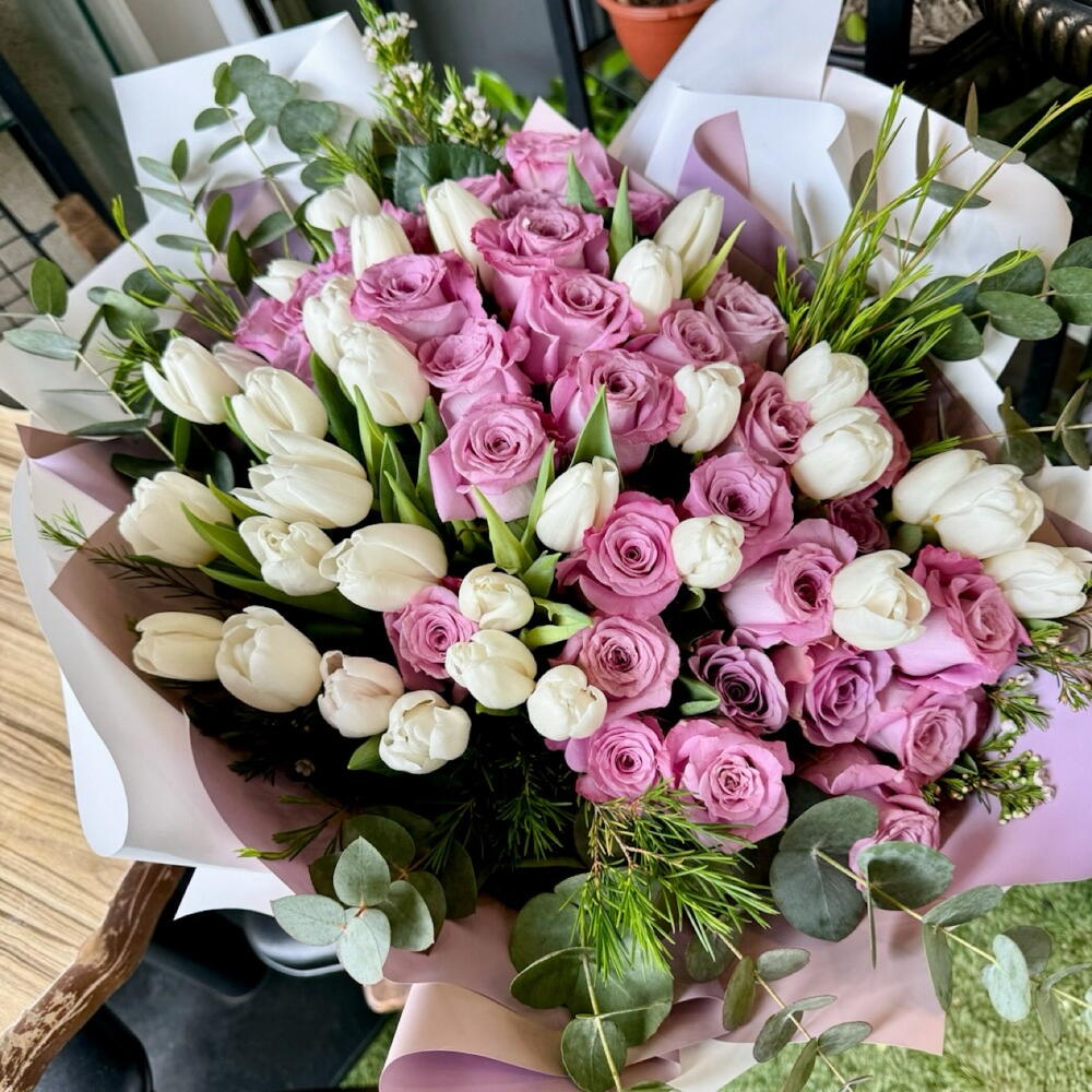 Этот особенный дизайнерский продукт состоит из 30 изысканных белых тюльпанов и 30 романтических розовых роз. Это впечатляющее цветочное украшение обогащено одним листом эвкалипта и листом руббелини. Эти специально разработанные листья добавляют дополнительное очарование, придавая этой цветочной композиции изысканный вид в любой обстановке. Выберите этот прекрасный цветочный букет, чтобы пробудить романтику внутри вас. Этот цветочный дизайн отражает свежую и живую красоту природы.