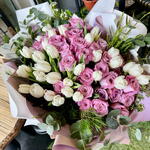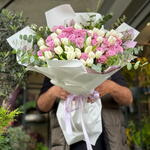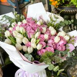 белые тюльпаны - 30 шт. розовые розы - 30 шт. листья окалиптуса и рубеллини - 1 шт.