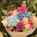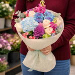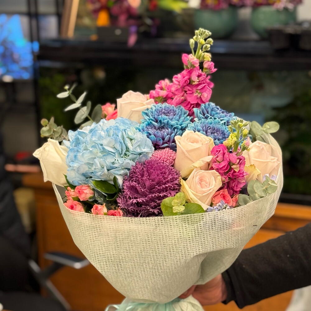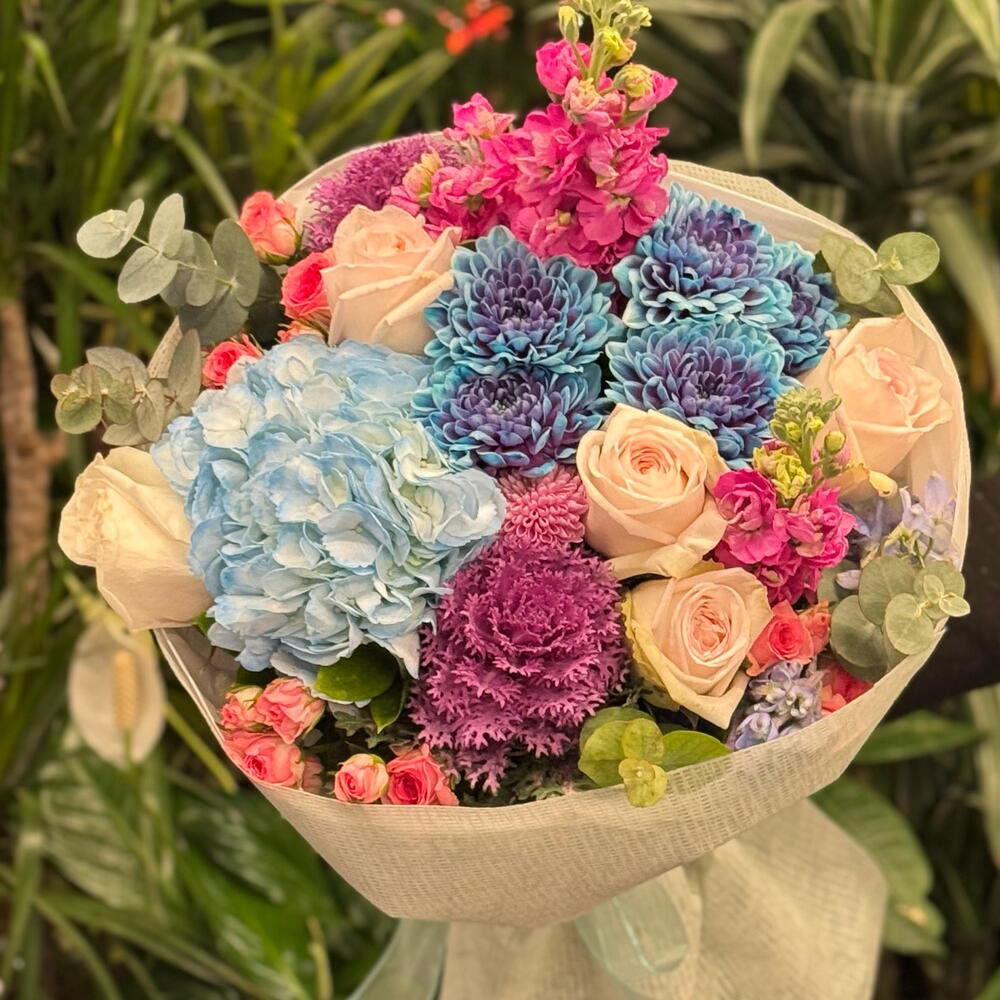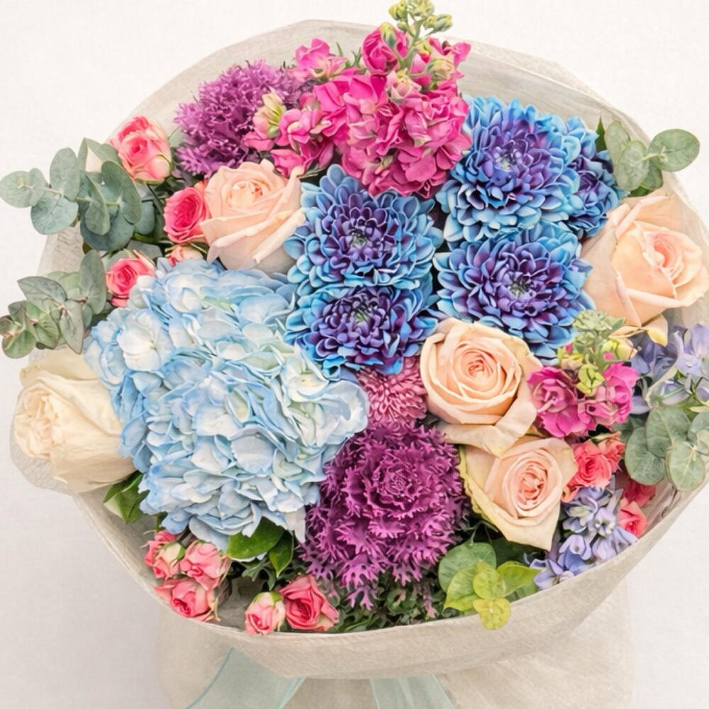 Пастельно-голубая Мечта – Букет из гортензии и роз Этот изящный букет, составленный из нежно-голубой гортензии, кремовых роз и фиолетовой анастасии, создаёт романтический и утончённый эффект. Благодаря умиротворяющей гармонии пастельных тонов он является одновременно стильным и трогательным вариантом подарка. Идеален для дня рождения, годовщины, в знак благодарности или в качестве искреннего сюрприза. Поставляется в современной и натуральной упаковке, вызывает восхищение с первого взгляда. Ежедневно готовится из свежих цветов и аккуратно упаковывается, отправляется в специальной сумке для букета.