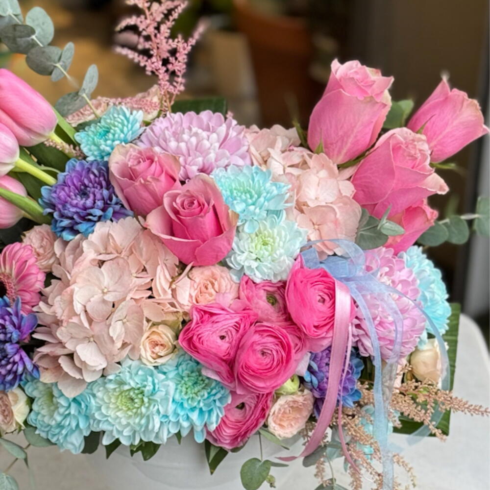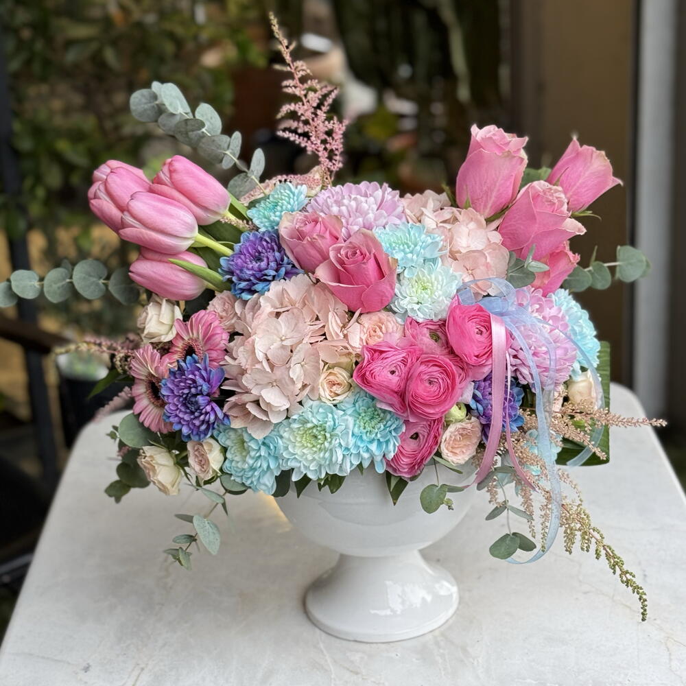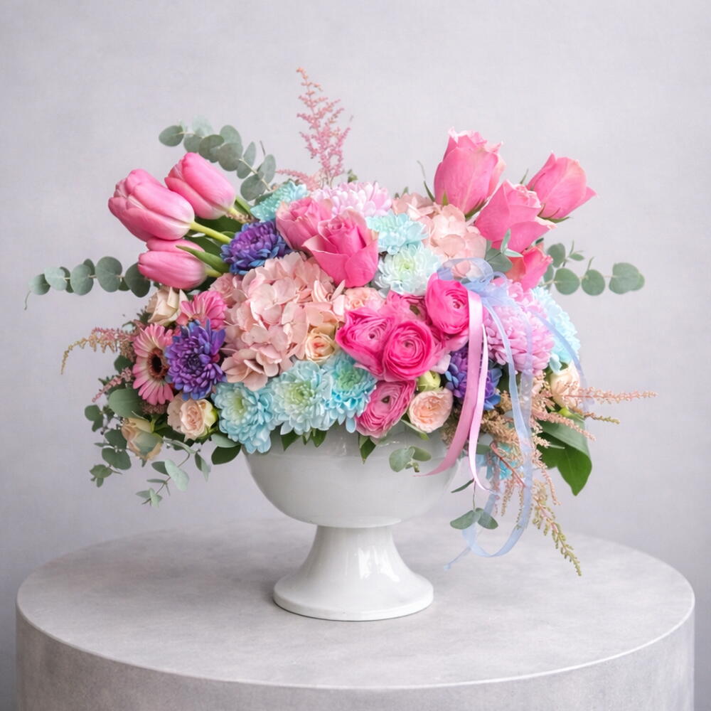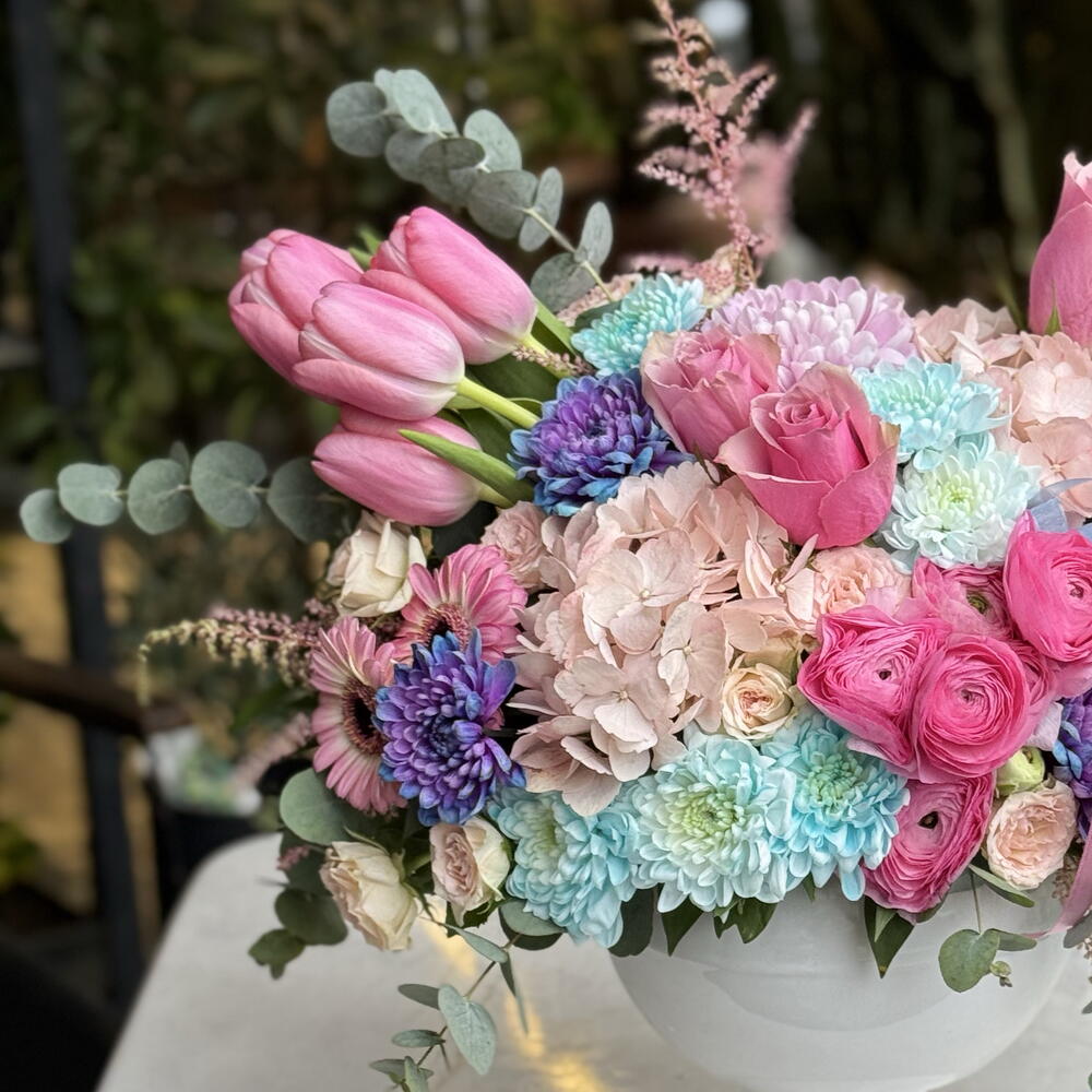Нежнейшее воплощение любви и изящества: Пастельные мечты 🌷✨ Подарите своим близким не просто цветок, а чувство. В этом букете, составленном из самых свежих розовых тюльпанов, роз — символа благородства, и голубых VIP-хризантем, несущих спокойствие неба, элегантность сочетается с современной формой бокаловидной вазы. Почему стоит выбрать этот товар? • Свежесть и качество: каждый цветок отбирается нашими опытными дизайнерами на первых лучах утра. • Современный дизайн: элегантная белая керамическая ваза продолжит украшать самый красивый уголок вашего дома даже после того, как подарок будет доставлен. • Гармония цветов: мягкие переходы розового и голубого придают любому пространству спокойствие и счастье. Для каких случаев подходит? • Дни рождения 🎂 • Годовщины ❤️ • Новая работа / поздравления 🥂 • Самый стильный способ сказать "Я тебя люблю".